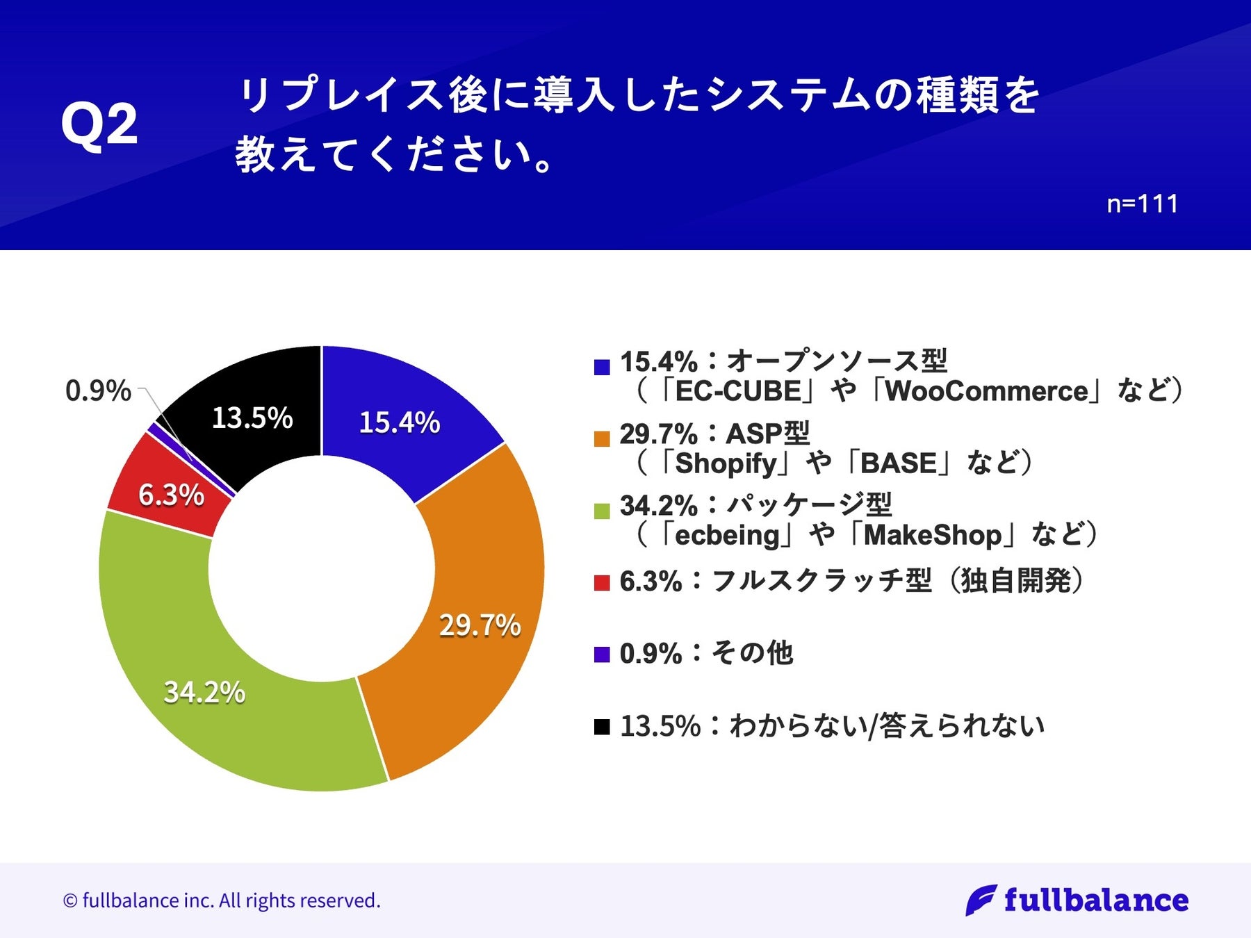 「Q2.リプレイス後に導入したシステムの種類を教えてください。」(n=111)と質問したところ、「パッケージ型(「ecbeing」や「MakeShop」など)」が34.2%、「ASP型(「Shopify」や「BASE」など)」が29.7%という回答となりました。