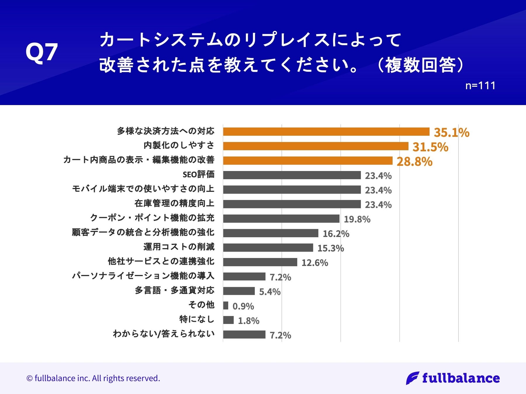 「Q7.カートシステムのリプレイスによって改善された点を教えてください。(複数回答)」(n=111)と質問したところ、「多様な決済方法への対応」が35.1%、「内製化のしやすさ」が31.5%、「カート内商品の表示・編集機能の改善」が28.8%という回答となりました。