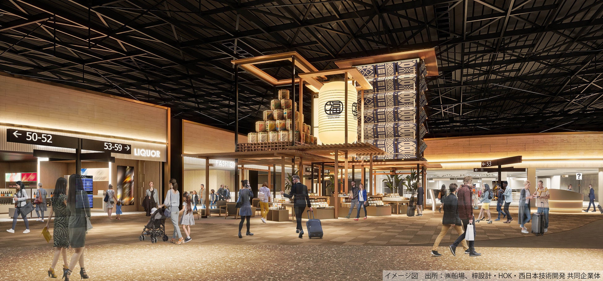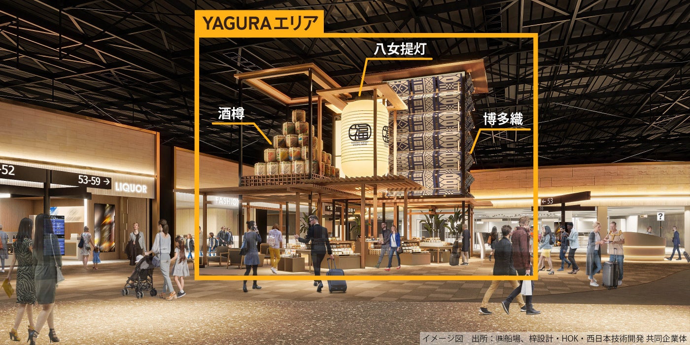 ウォークスルー型となる新免税店の中央には「YAGURA」エリアを設けます。八女提灯・博多織・酒樽から成る高さ8.7mの大型櫓を設置し、福岡らしさ・日本らしさを演出するほか、フォトスポットとしてはもちろんのこと、集合場所にもなる福岡空港国際線の新たなランドマークが誕生します。