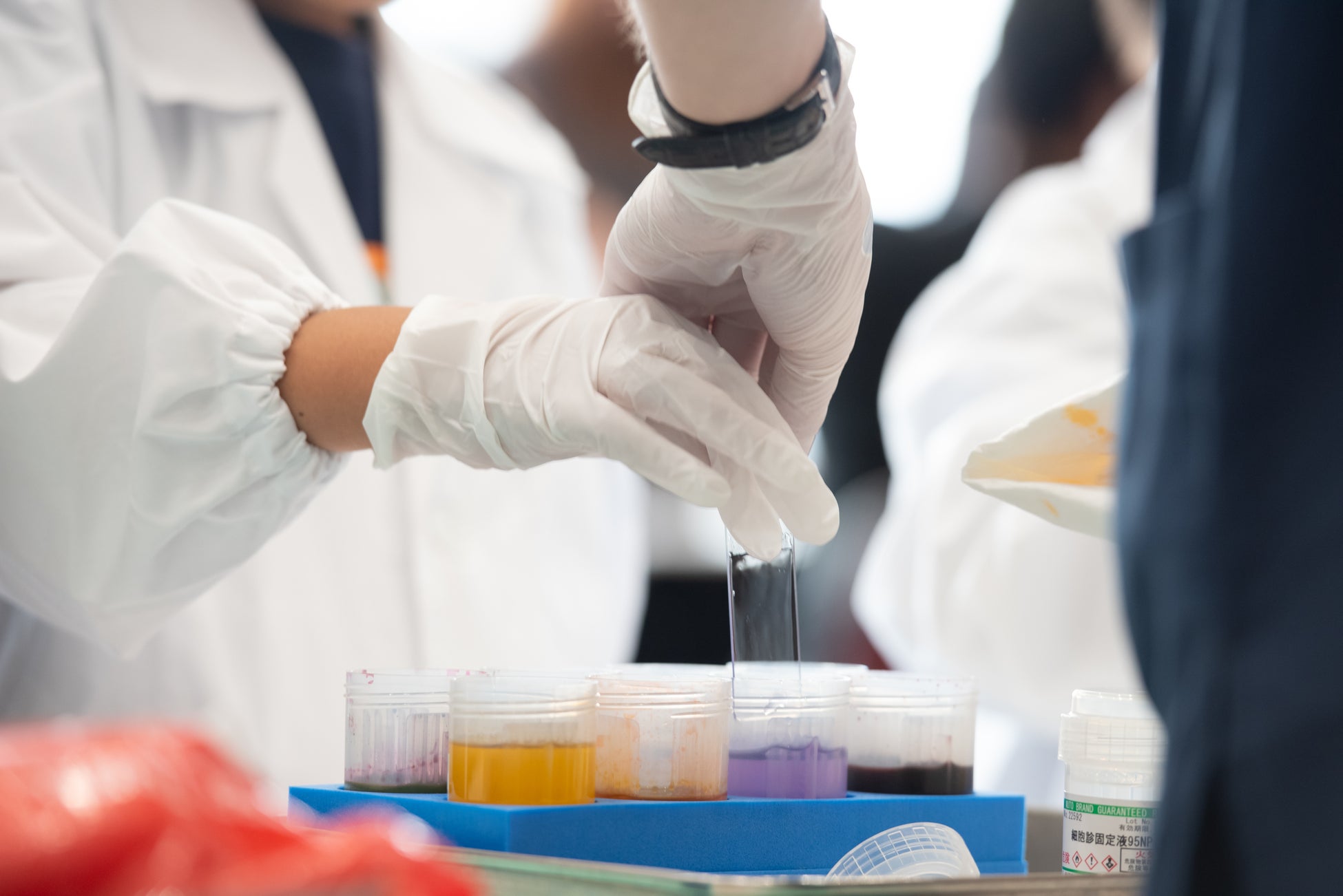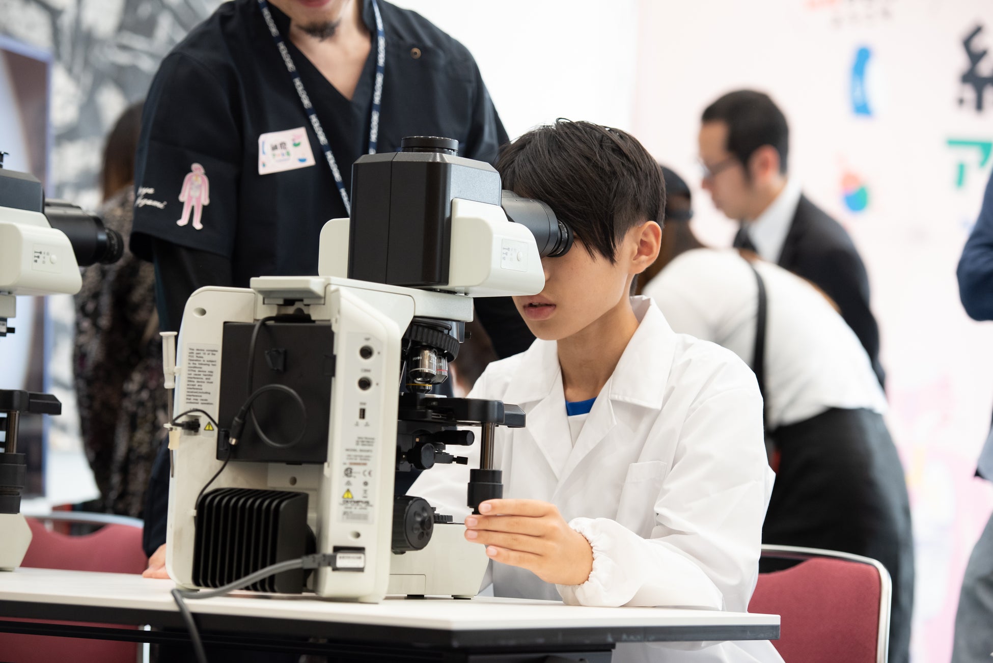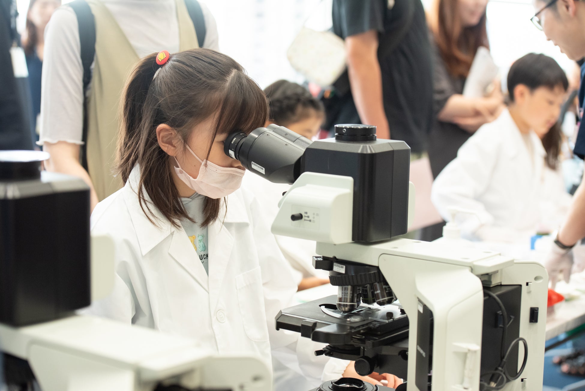 小学生から高校生まで多くのお子さまにご参加いただき、会場は大盛況でした。細胞診専門医や細胞検査士のレクチャーを受けながら、自分自身の細胞を染色し、顕微鏡で観察する子どもたち。夢中になって顕微鏡を覗き込んでいました。