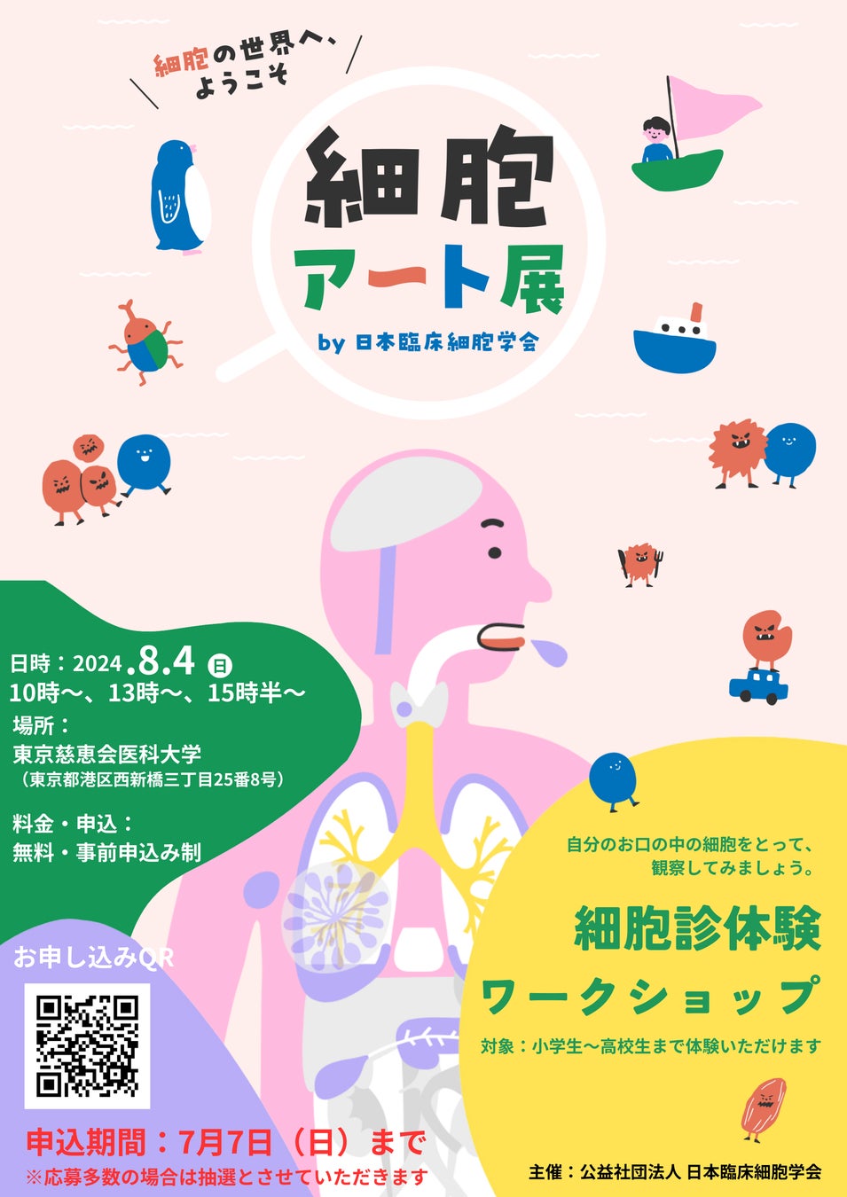 公益社団法人 日本臨床細胞学会(学会事務局:東京都千代田区、理事長:岡本 愛光、以下「当学会」)は、公益社団法人化10周年を迎え、周年企画として細胞や細胞診について楽しく理解してもらう「細胞アート展」を開催しています。本企画のリアルイベントとして、2024年8月4日(日)に東京慈恵医科大学(東京都港区)にて「細胞診体験ワークショップ」を開催します。小学生〜高校生を対象に細胞染色、検鏡を中心とした体験型イベントとなっております。
