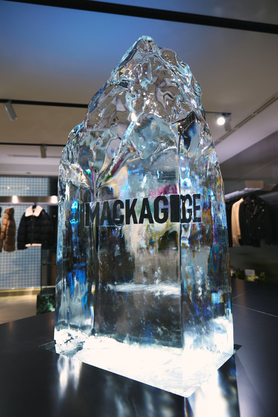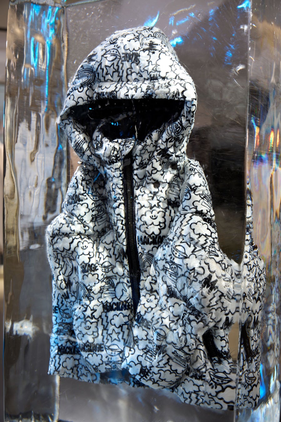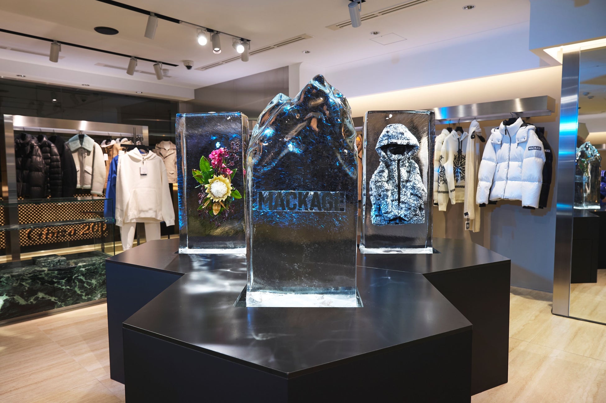 オープンを記念し、11月6日に開催されたレセプションパーティーでは、氷柱の中にダウンジャケットやロゴを封じ込めたオブジェを並べ、冬のムードを盛り上げました。