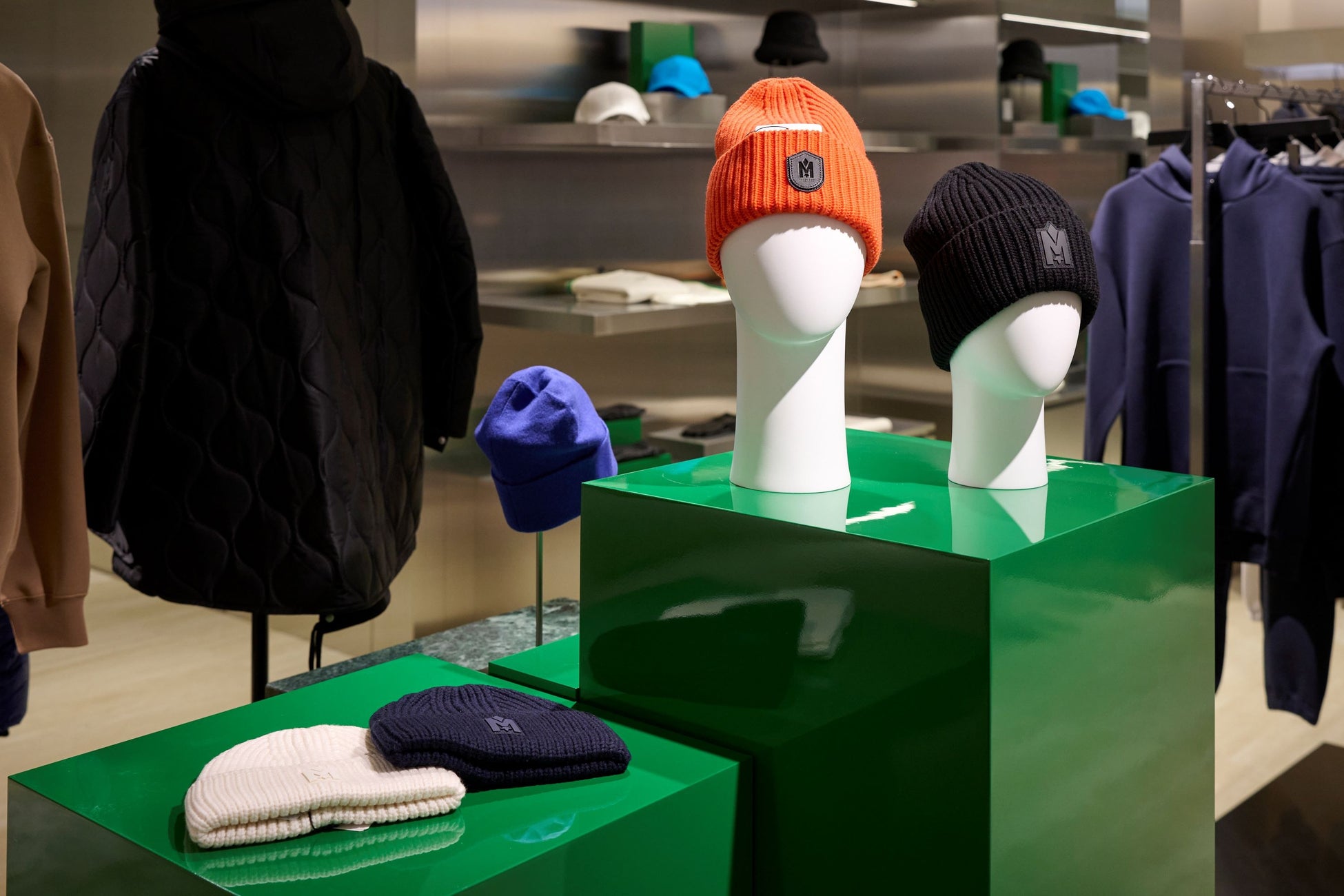 2階はメンズアイテムを中心に構成され、アウターやアパレル・小物、ユニセックスのラウンジウェアが並ぶほか、日本では初登場のスキーコレクションも揃います。