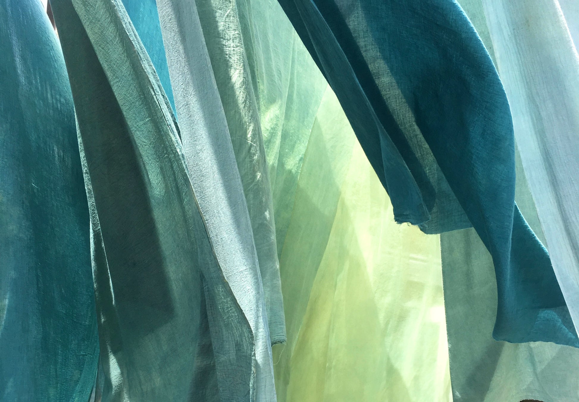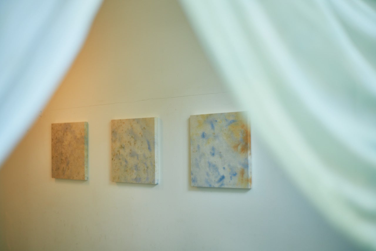 植物染料を基に鉱石、貝殻、土など天然から成る色を用いて空間作品や染色画などの創作活動を行う。