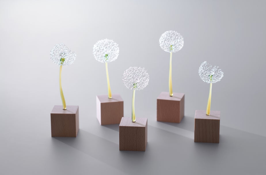 自然界に共通して現れる水の形には、自然が創りだす形の神秘が隠れています。水の流れや泡を“生命の始まりの形”ととらえ、流動的なガラスから生命が芽吹く様をイメージした作品を制作している。