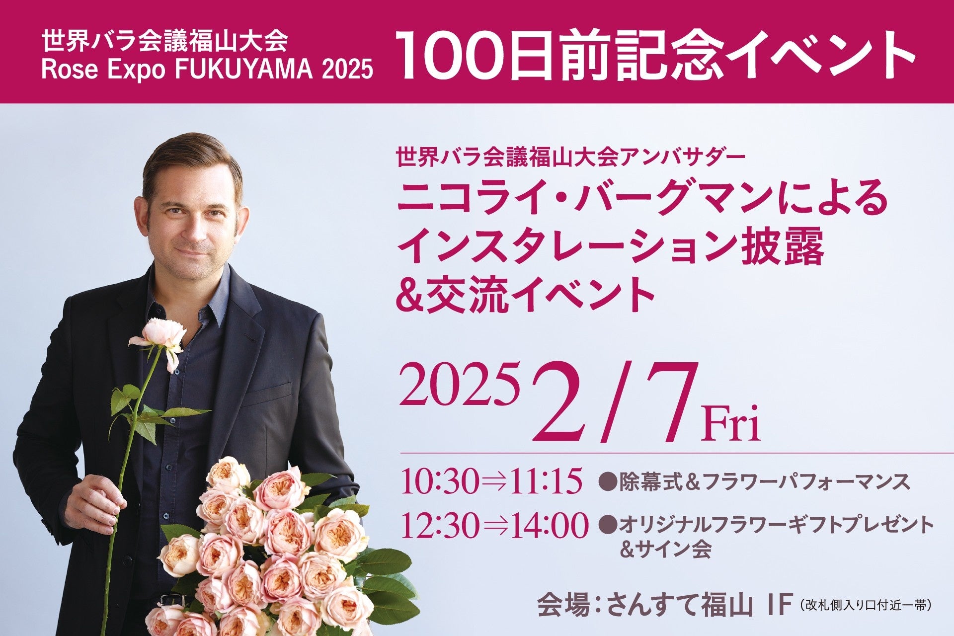 2025年2月7日(金)、世界バラ会議福山大会実行委員会(事務局:福山市世界バラ会議推進室)は、JR福山駅直結の商業施設「さんすて福山」(福山市三之丸町30-1、運営:山陽SC開発株式会社)と連携し、「第20回世界バラ会議福山大会2025」・「Rose Expo FUKUYAMA 2025」開催100日前を記念した、同大会アンバサダーのニコライ・バーグマンによるインスタレーションの披露&交流イベントを開催します。