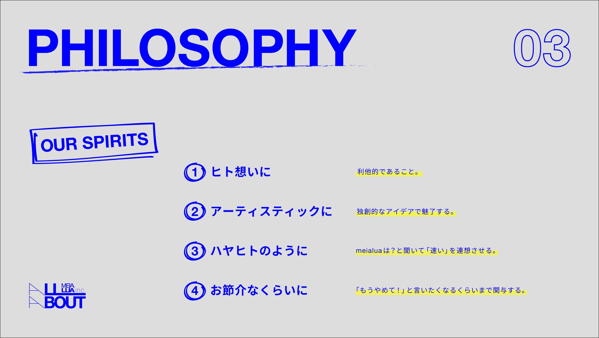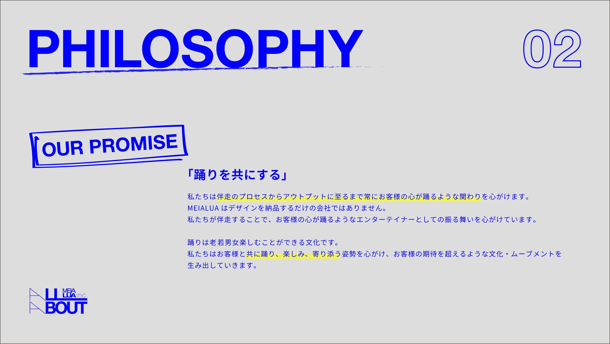 しかし近年、ブランド戦略やビジュアル制作にとどまらず、事業コンセプトの構築や教育連携、自社事業など活動領域が拡大する中で、社外との接点において「MEIALUAは何者か?」という問いに、共通言語で応えられる体制づくりが必要となりました。