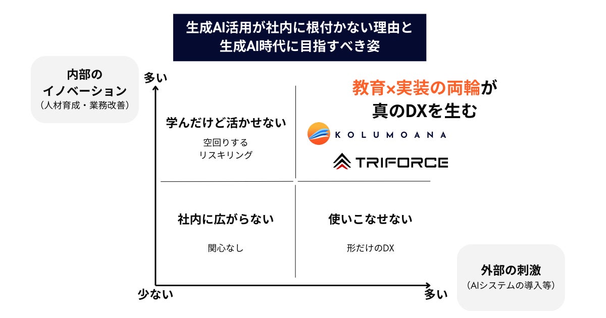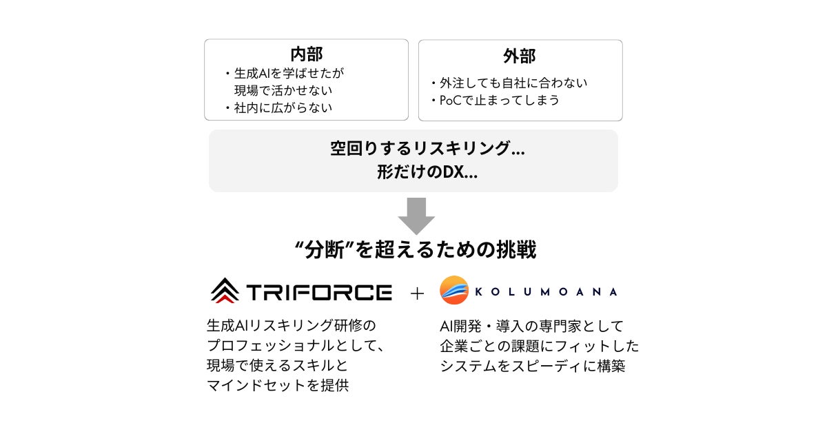 このような背景のもと、コルモアナとトライフォース社は、生成AIの実装と人材育成を一体で支援する体制を築くため、業務提携に至りました。