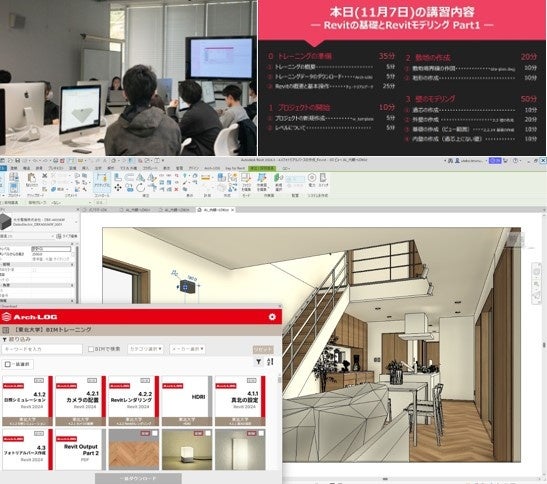 前半のセッションではBIMの基礎知識とソフトの基礎操作方法、並びにモデリング技術を、後半ではArch-LOGのBIMデータを利用し応用技術と実践的なアウトプットの作成方法を学べるカリキュラムとしました。