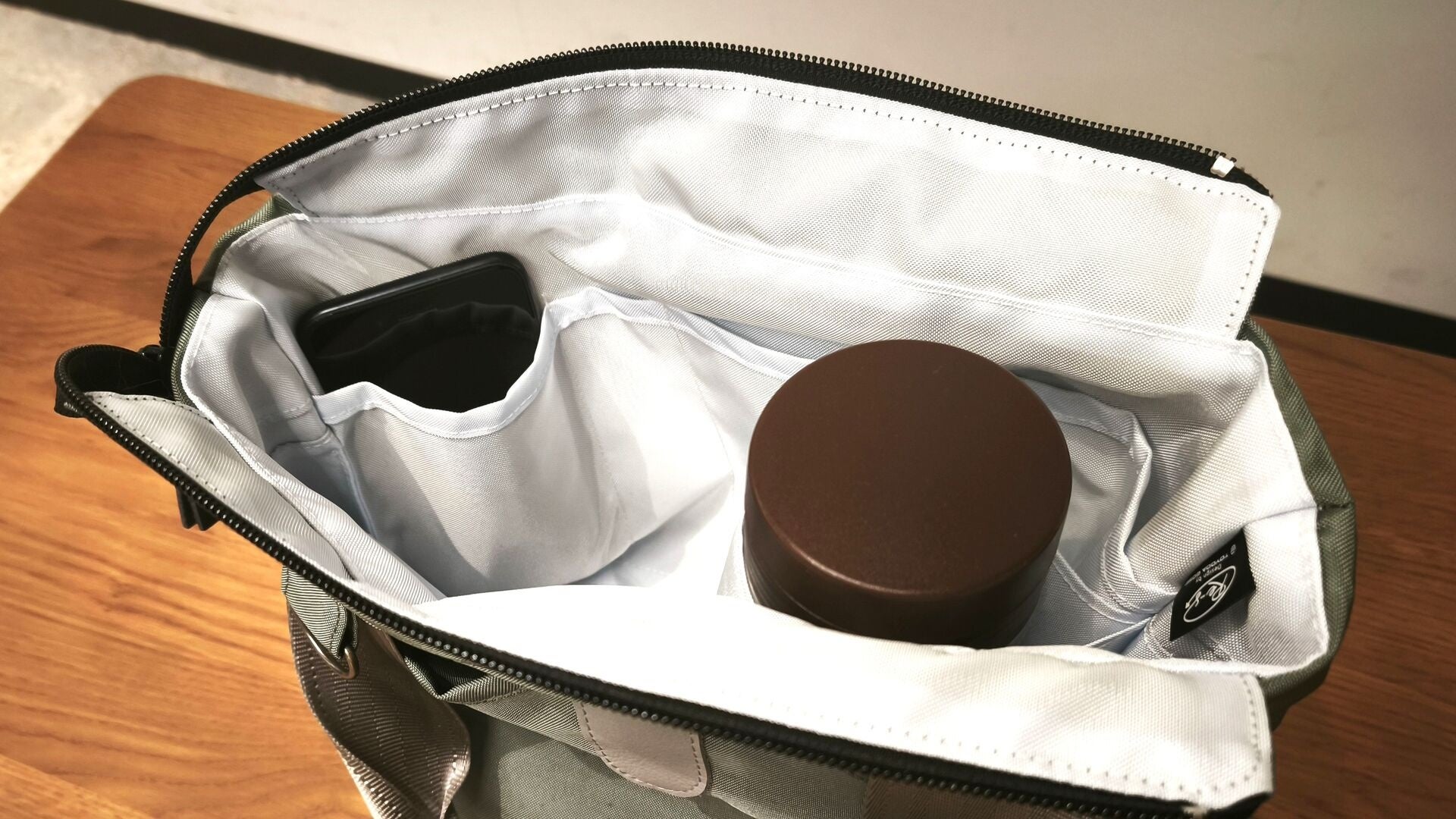マチ付で500mlペットボトルが4~5本入るほどの収納力。内側にはジッパー付きポケット、ドリンクホルダー、ペン差し。外側にもボタン付きポケットを備えています。