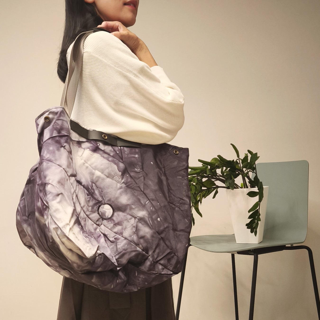 助手席用のエアバッグをそのまま活かし、糸染めの釜に入れて染色加工を施したトートバッグです。