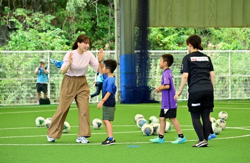 綾瀬さんも夢の舞台でサッカーを楽しむ子どもたちに“がんばれー!”“ナイッシュー!!”と声をかけ、ハイタッチを交わす場面も。さらに綾瀬さん自身も練習やミニゲームに加わって華麗なシュートを決めるなど、子どもたちとともに、“プロのセカイ”を堪能しました。子どもたちも、森﨑さんの容赦ないドリブルに凄みを感じながらも、教わったことを存分に発揮しながら、パスを繋いで次々とゴールを決めていきました。わずかな時間ではありましたが、次の予定のため、ここでコートを後にする綾瀬さんから最後に“暑い中だけど、水分補給をしながら、最後まで楽しんでください!”と優しく綾瀬さんらしいエールを送り、サッカー教室を締めくくりました。移動するバスの中では、子どもたちから森﨑さんへ「何歳からサッカーをはじめたんですか?」「今日の試合で誰がゴールを決めると思うか?」など質問が飛び交い、サッカー教室を振り返りながら更なるアドバイスを送りました。
