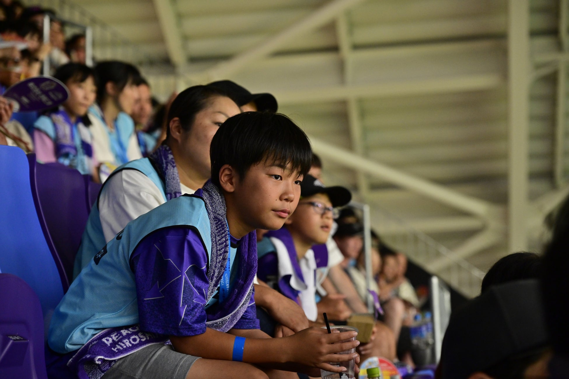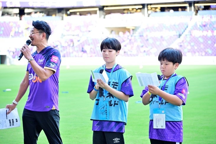 ハイタッチをしながらピッチへ送り出し、子どもたちは試合を前にした選手たちの緊張感を、間近に感じることができました。さらに2万5千人を超える観客を迎えたスタジアムで、試合前のセレモニー「フラッグベアラー」を務めた子どもたち。選手たちがいつも浴びている歓声やチャントが響くピッチ上で、堂々とその大役を果たしました。