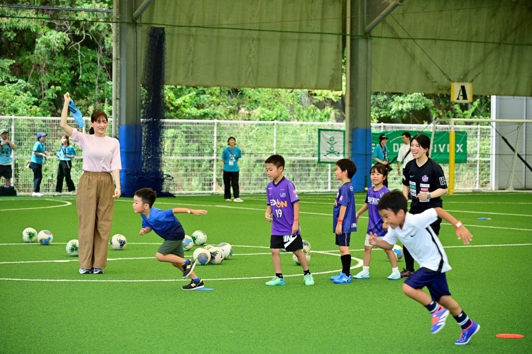 当日は、全国の多数の応募の中から選ばれた小学1~6年生の子どもたちと保護者30組が参加する中、午前の部のサッカー教室には、地元広島の出身である俳優の綾瀬はるかさんが、ドコモ未来フィールドの応援サポーターとして登場※2。サッカー教室開催にあたり、キックオフのご発声や夢に向かって歩き出す子どもたちにエールを送りました。その他、元Jリーガーで現在はサンフレッチェ広島のクラブリレーションズマネージャーを務める森﨑和幸氏の指導によるサッカー教室を実施した後に、スタジアムへ移動し、DJ体験・フラッグベアラーなどのキッズアクティビティ、試合観戦、ピッチの芝生整備のお仕事体験など、サッカーのプロのセカイを体験できる貴重なプログラムを実施しました。