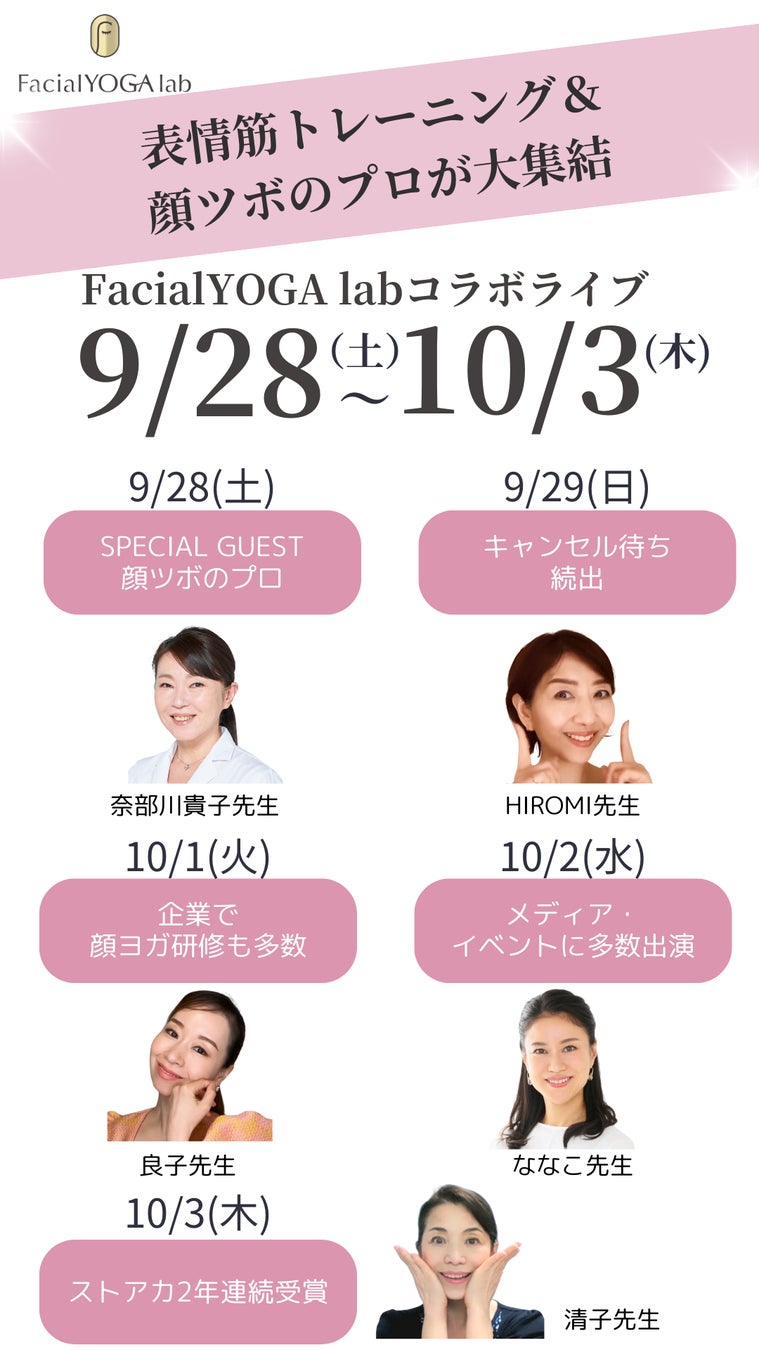 顔ヨガ協会の表情筋スペシャリスト達や顔ツボのエキスパートと、若々しさを保つ秘訣を提供するインスタグラムでのコラボライブを9/28(土)~10/3(木)にて実施します。セルフケアを始めてみたい方、顔ヨガ初心者の方、顔ヨガ経験者の方、誰でも楽しめる内容になっています。大人気の先生からコツを教えてもらえる貴重な時間となります。