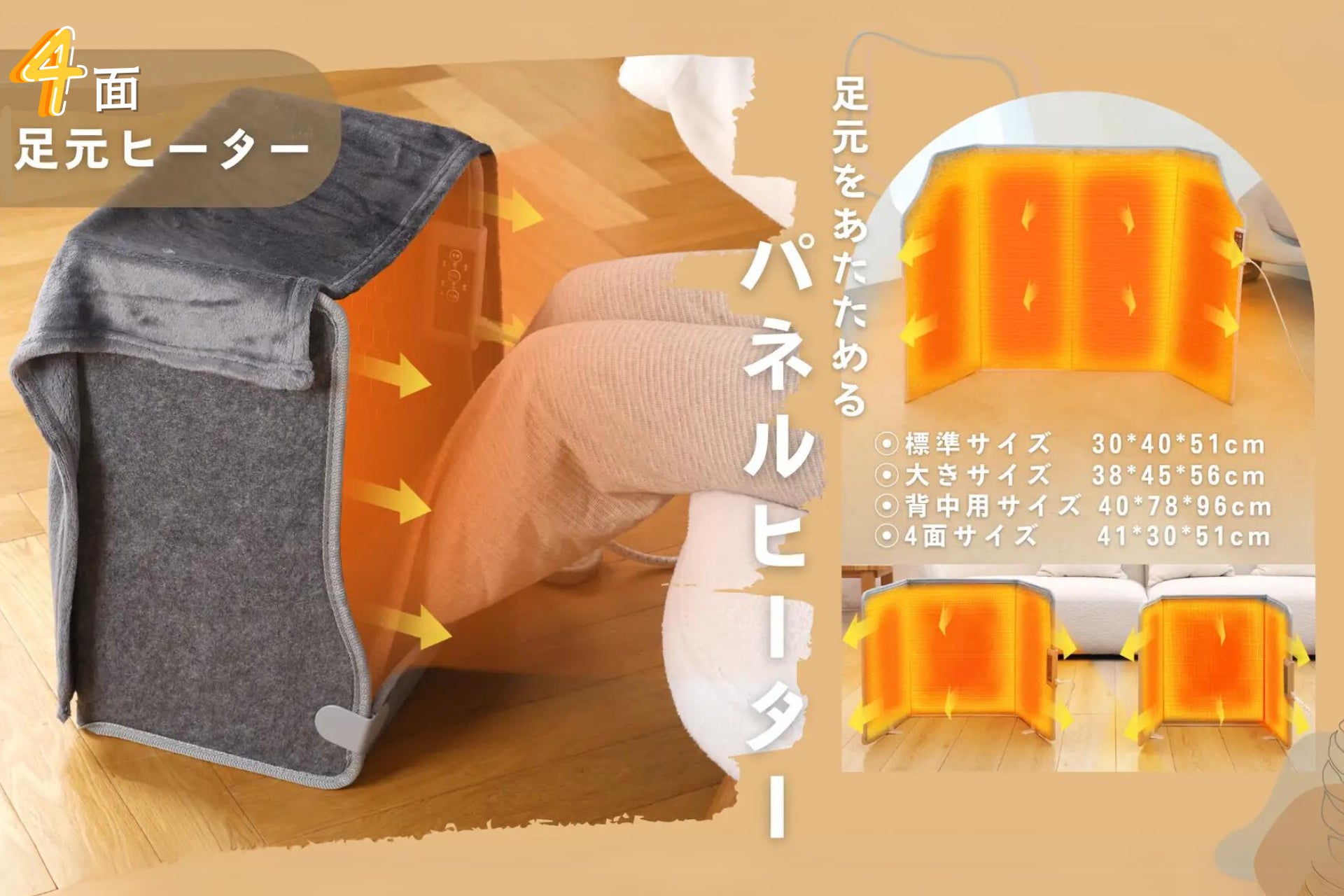 最新モデルの5面パネルヒーター「MT-PH-003」に加え、昨年多くのお客様にご好評をいただいた4面パネルヒーター「FPH-G23」も引き続きご提供しております。また、長年にわたり安定した人気を誇り、これまでに数十万人のご愛用者から高い評価を受けている3面パネルヒーター「FPH-G11」もご用意しています。どのモデルも、快適な暖房環境を提供するための高品質な製品となっており、お客様のさまざまなニーズにお応えできるラインナップとなっております。また、ふわふわなブランケットが付属しており、熱量を逃げない!