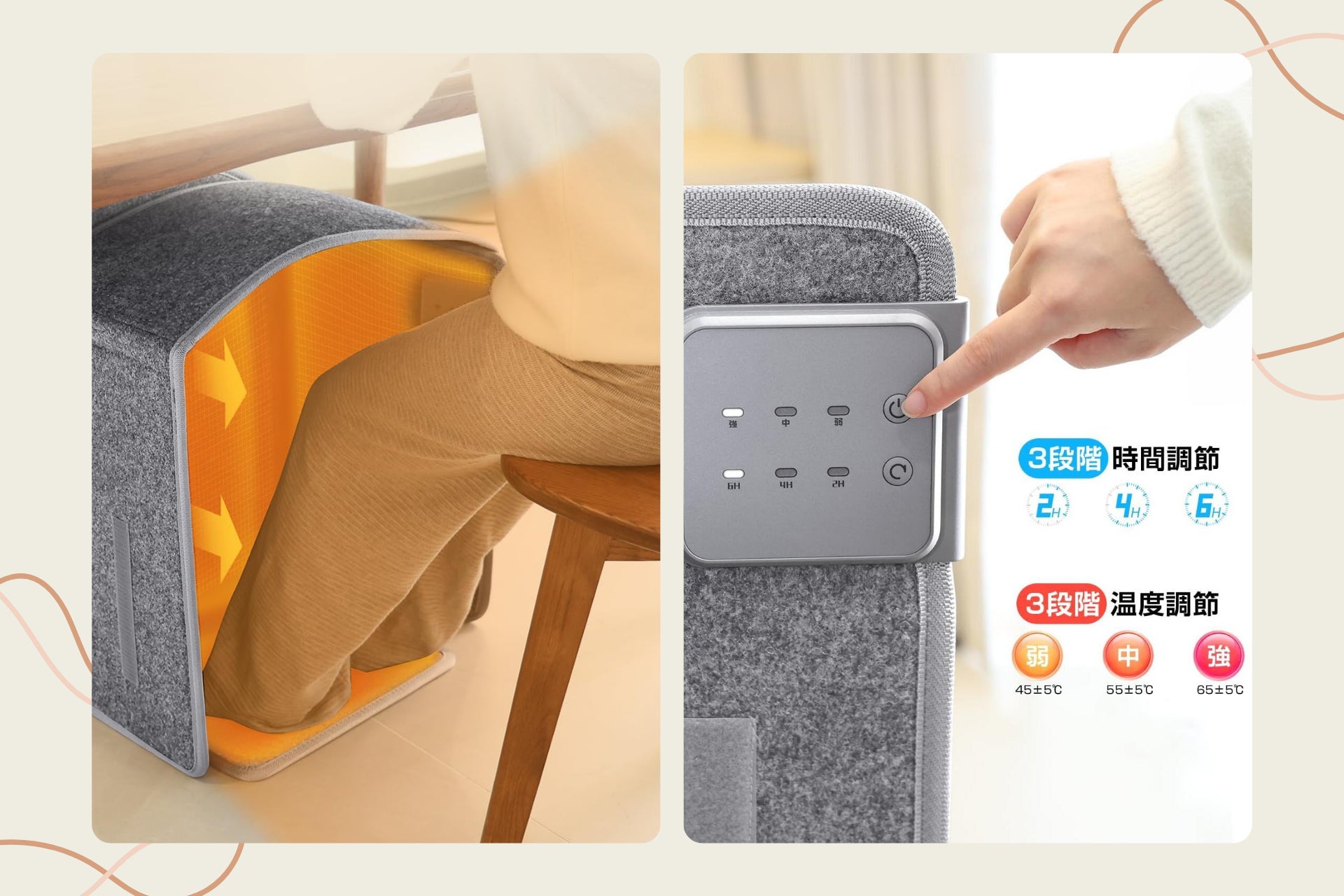 ✅ 3段階の温度調節機能(強70℃・中60℃・弱50℃)があり、スイッチを入れるだけで手軽に膝下や足元を温められます。