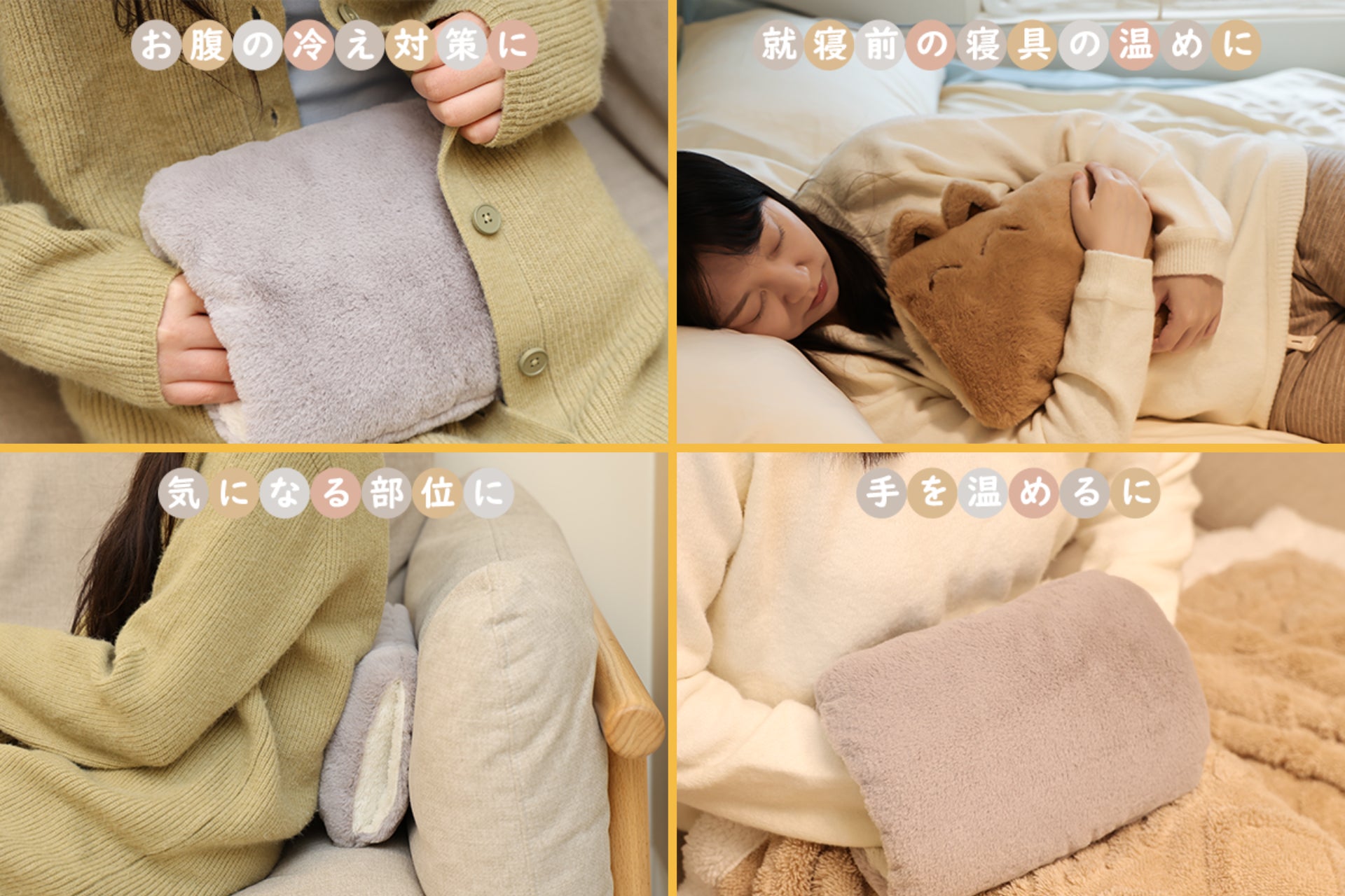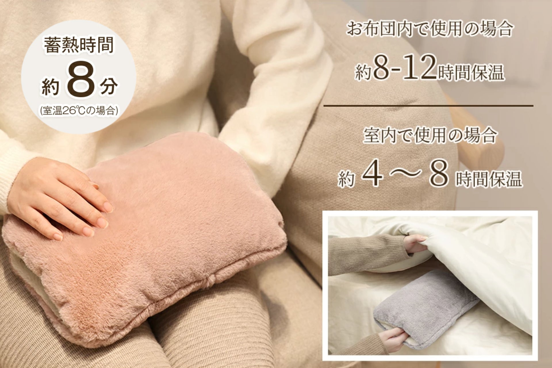充電式湯たんぽは、お湯を用意する手間がなく、数分の充電で長時間使用可能です。電源不要と軽量で持ち運びも非常に簡単です。女性や子ども、高齢者でも手軽に好きな場所に持ち運べ、すぐに暖まれます。寝室はもちろん、リビングや職場、車内、屋外でのキャンプなど、寒くなった時にすぐ使えて便利です。また、シンプルで上質なデザインは冬のギフトに最適です。ふわふわ素材のカバーは、心も癒すリラックスタイムを提供します。