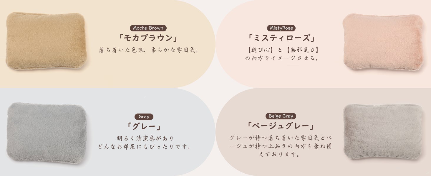 モカブラウン、ミスティローズ、グレーとベージュグレーの4色展開です。