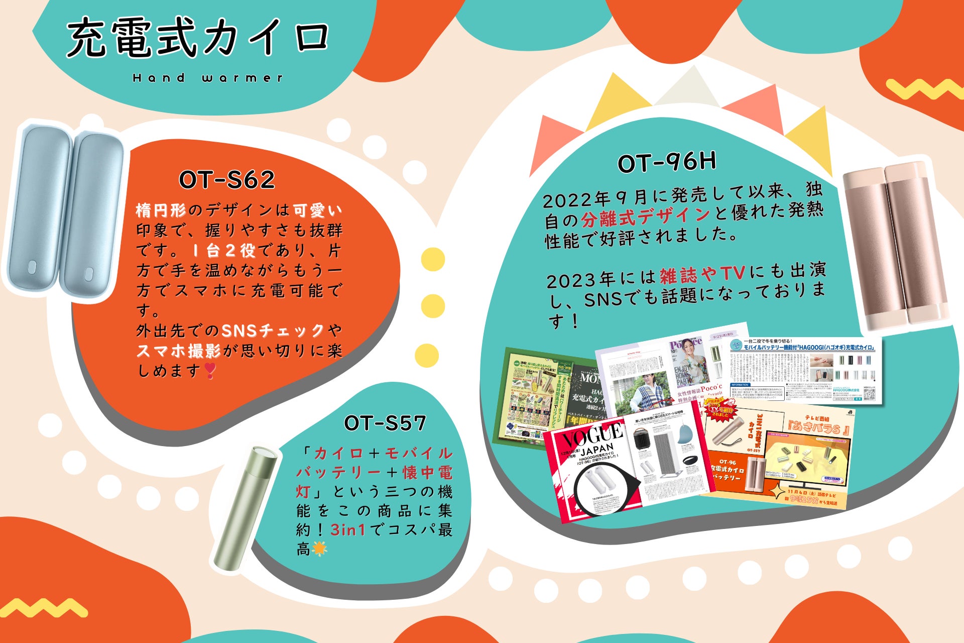 充電式カイロ「OT-96H」は、2022年9月に発売されるやいなや、画期的な分離式デザインと優れた機能が瞬く間にSNSで注目を集めされました。これまでにない使いやすさとデザイン性が多くのユーザーに評価され、寒い季節に欠かせないアイテムとして広く愛用されており、関連投稿の総閲覧回数は5,000万回を突破しました。そして、愛用者の皆様から数々の貴重なご意見を寄せられました。
