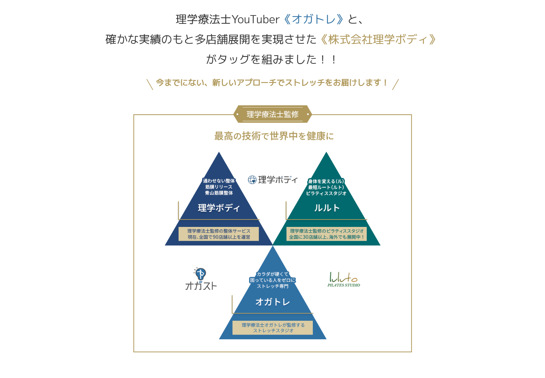 登録者154万人の理学療法士のストレッチ専門YouTubeチャンネル「オガトレ」と、国内外123店舗運営の「理学ボディ」が共同で本格オーダーメイドストレッチ『オガスト』を東京で初出店します!