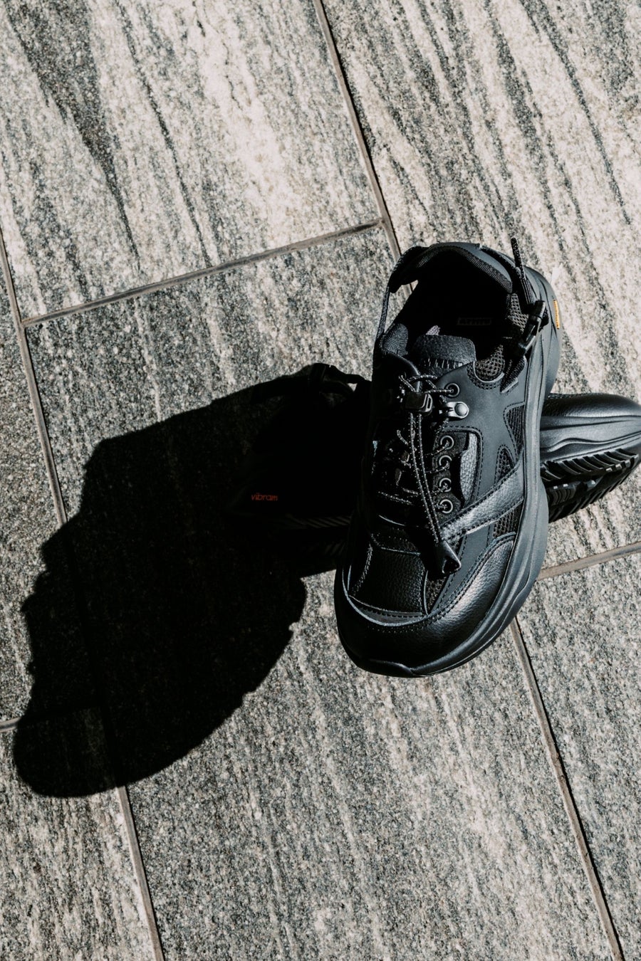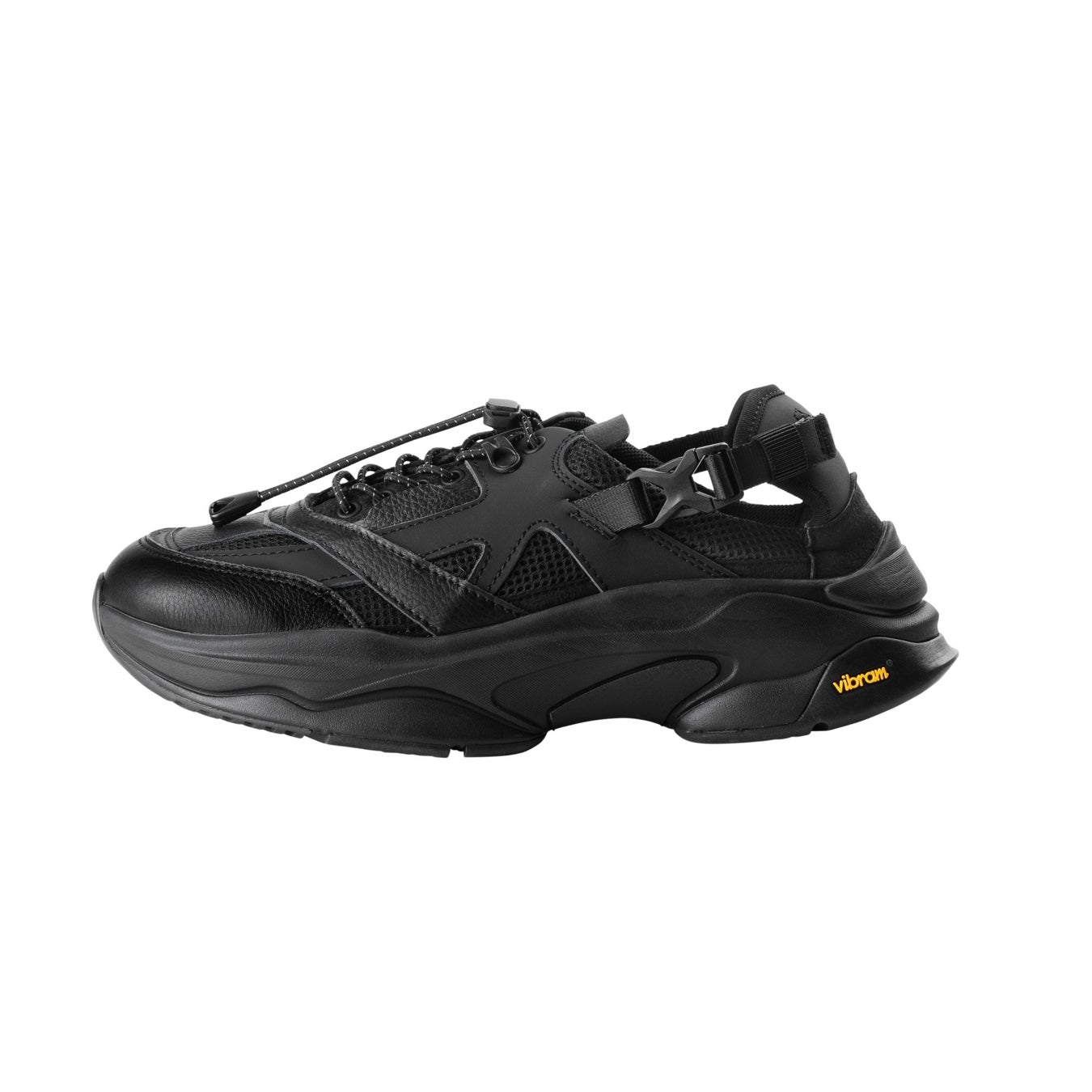 2種のレザーとメッシュ、スエード調素材をアッパーに組み合わせ、ブラックのワンカラーでまとめたミニマルなルックス。バックル付きサイドストラップと伸縮性のあるシューストラップがフィット感を高め、スリッポンのような着脱を可能にします。Vibram社のソールを採用し、革靴とスニーカーの中間のようなバランスで足元に抜けをつくります。3サイズ展開。