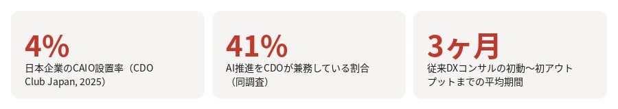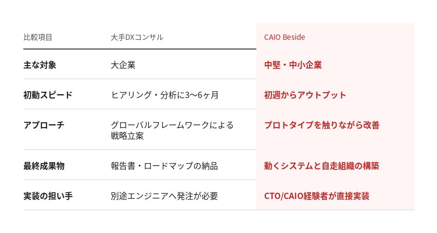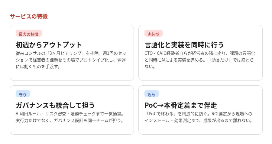 現在大手コンサルファームがCAIO支援サービスを相次いで開始していますが、これらのサービスは主に大企業を対象としており、グローバルフレームワークを活用した戦略立案と組織設計が中心です。中堅・中小企業が直面する「PoC止まり」「属人化」「実行者不在」という具体的な課題には届いていないのが実状です。こうした市場の空白を埋めるため、「言語化と実装を同時に行う」という新しいモデルでCAIO Besideを立ち上げました。