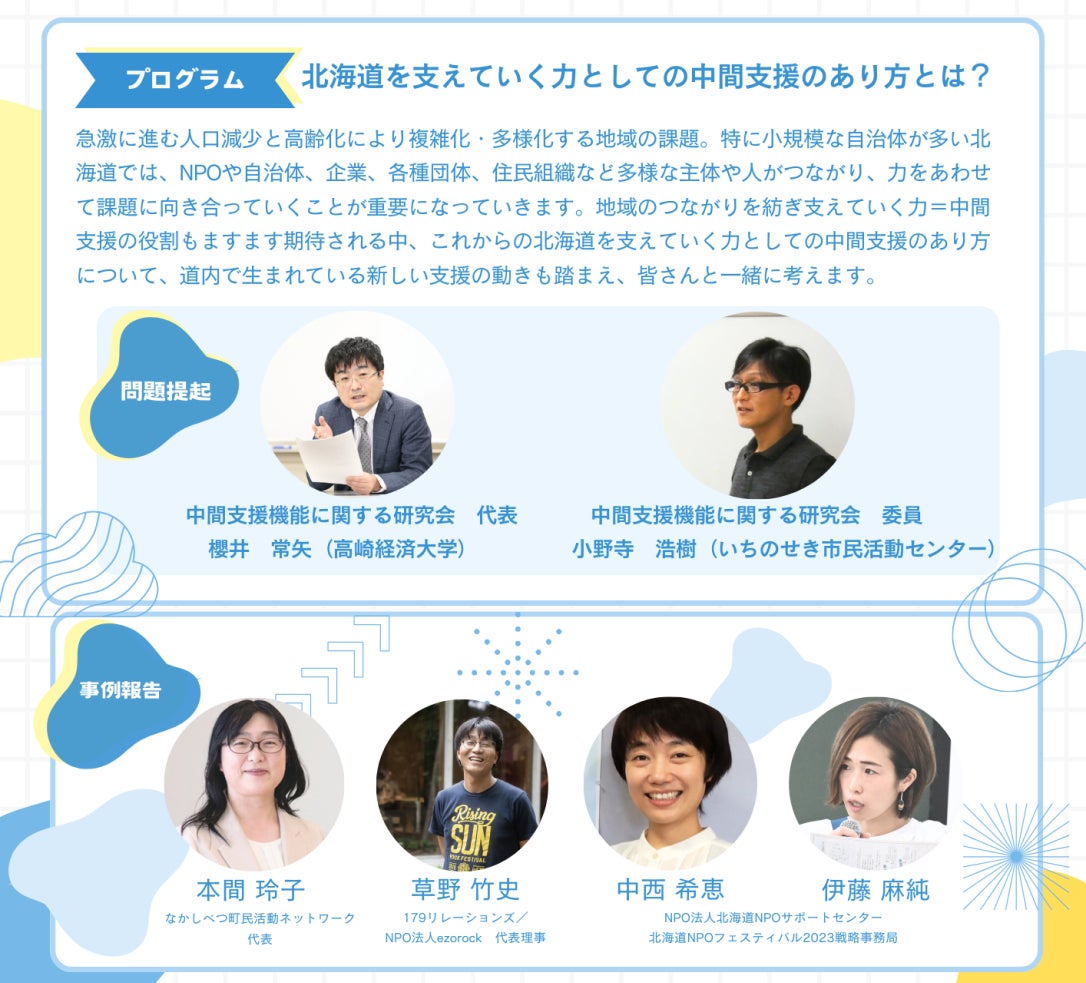 急激に進む人口減少と高齢化により複雑化・多様化する地域の課題。特に小規模な自治体が多い北海道では、NPOや自治体、企業、各種団体、住民組織など多様な主体や人がつながり、力をあわせて課題に向き合っていくことが重要になっていきます。またそうした地域のつながりを紡ぎ支えていく力=中間支援の役割もますます期待されます。