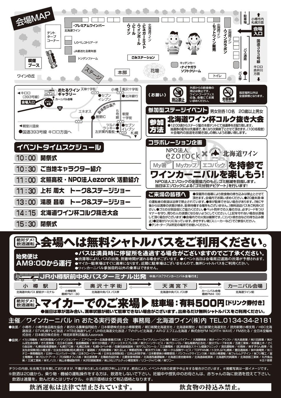 会場への移動手段として、JR小樽駅前中央バスターミナルより無料シャトルバスを運行いたします。(マイカー利用でご来場の場合は1台500円の駐車料金をお申し受けいたします。※ドリンク券付き)