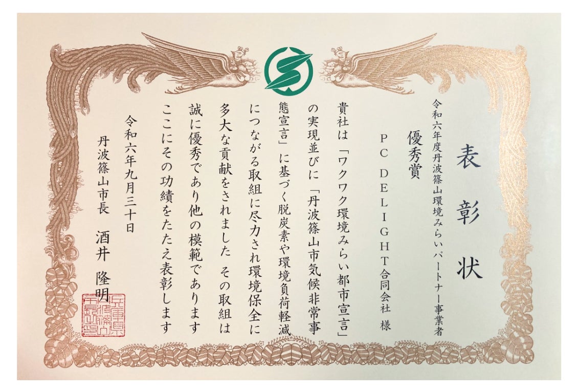 PCDELIGHT合同会社(本社:兵庫県丹波篠山市)は、丹波篠山市環境未来パートナー事業において、「優秀賞」を受賞しました。