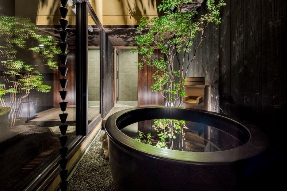 入口の暖簾をくぐり、客室に向かうまでの路地が京都でのスペシャルな宿泊体験を予感させます。桜、竹、梅、楓と4つのコンセプトのお部屋には、それぞれ特徴的な「湯」体験ができる浴空間を新たに設けました。内風呂や露天風呂など、お部屋によって異なる体験をお楽しみいただけます。