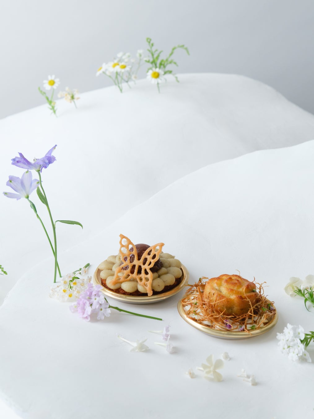 タタンモンブラン(画像左):旬の紅⽟りんごを3 時間じっくり焼き上げたタルトタタンに、和栗のクリームを合わせました。クリームは花びらのように絞り上げ、秋に咲く⼀輪の花を表現。蝶のシガレットを添えて仕上げています。