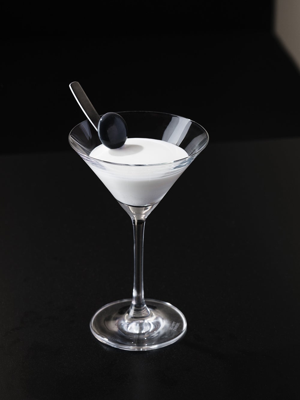 束芋が⽩という⾊のイメージに感じる「怖さ」を表現したミルクベースの⽢いカクテル。束芋がカクテル に合わせてデザインしたコースターも数量限定で配布予定。