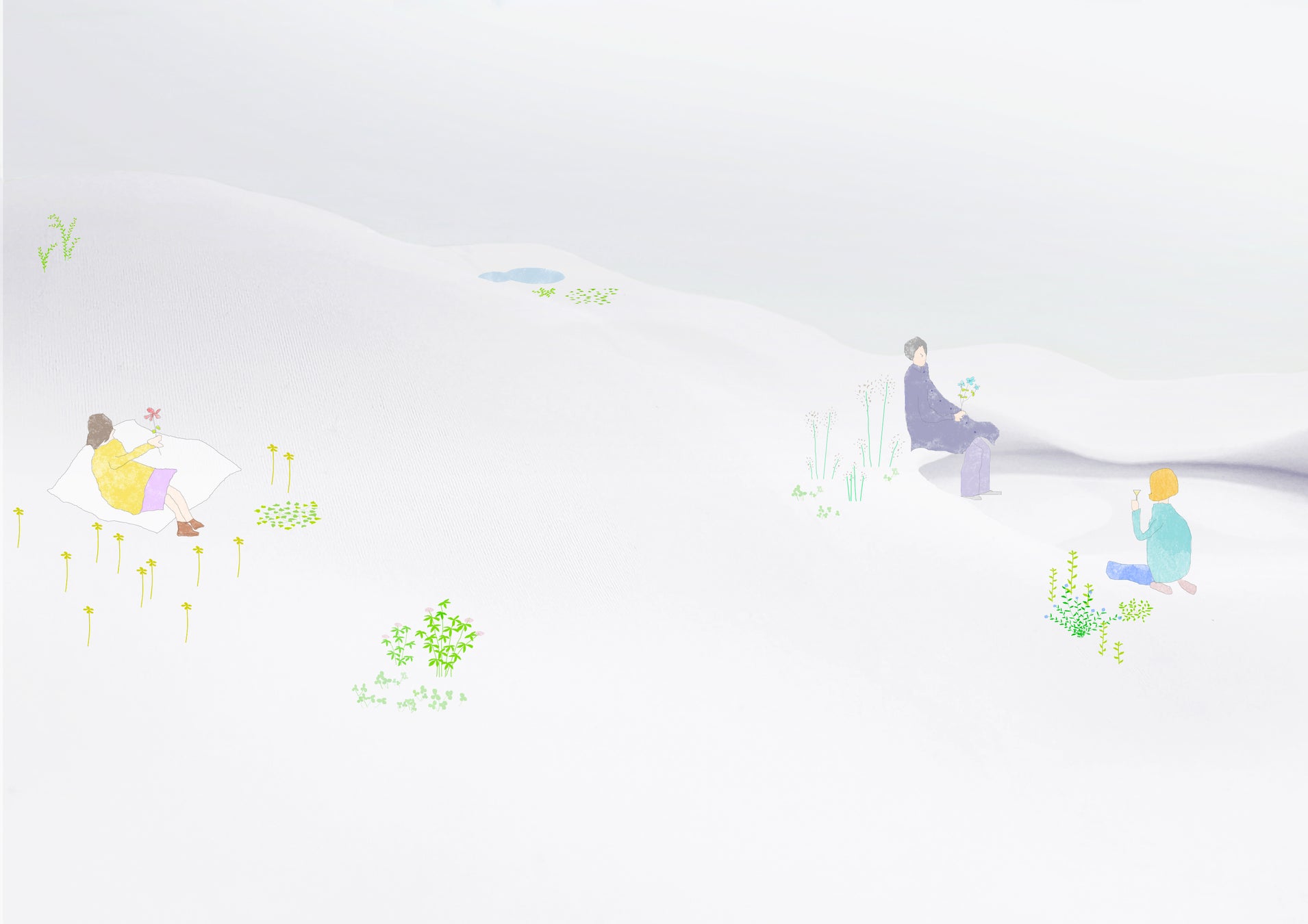 ⼤地のような、お⽫のようなランドスケープ。集まる⼈々が⾷や⾳、交流を楽しむ憩いの場。「Glass harp music for the Eiko Tomuraʼs landscape」は、場・⾷・⾳を繋げ、それらが寄り添い⾳楽として昇華することを意図 している。演奏に使われるのは、グラスに⽔を⼊れ濡れた指でグラスを擦って持続⾳を鳴らす「グラスハープ」。 サウンドインスタレーションが鳴る中、⾳楽家の⾓銅真実と Julia Shortreed が観客にグラスを配り、両者の 指揮のもと演奏をしてもらう。そのサウンドは五線譜で決められたようなものではなく、パフォーマンスの度に表情を変え、その時々に新しく⽣まれる⾳楽となるだろう。