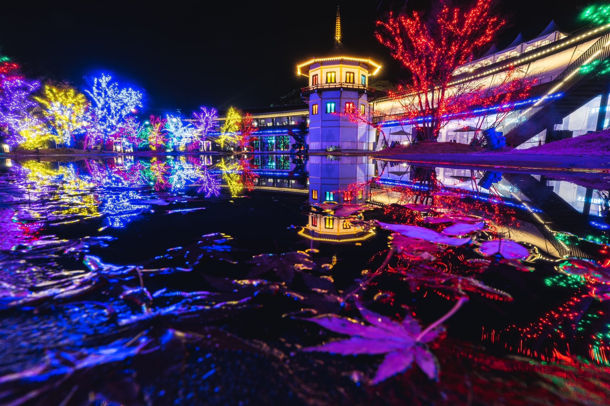 期間限定で宮城県松島離宮が、16万球の7色に輝くイルミネーションに彩られる幻想的な世界に包まれます。松島湾を模した庭園内の水盤にライティングが映り込む美しい情景をお楽しみください。