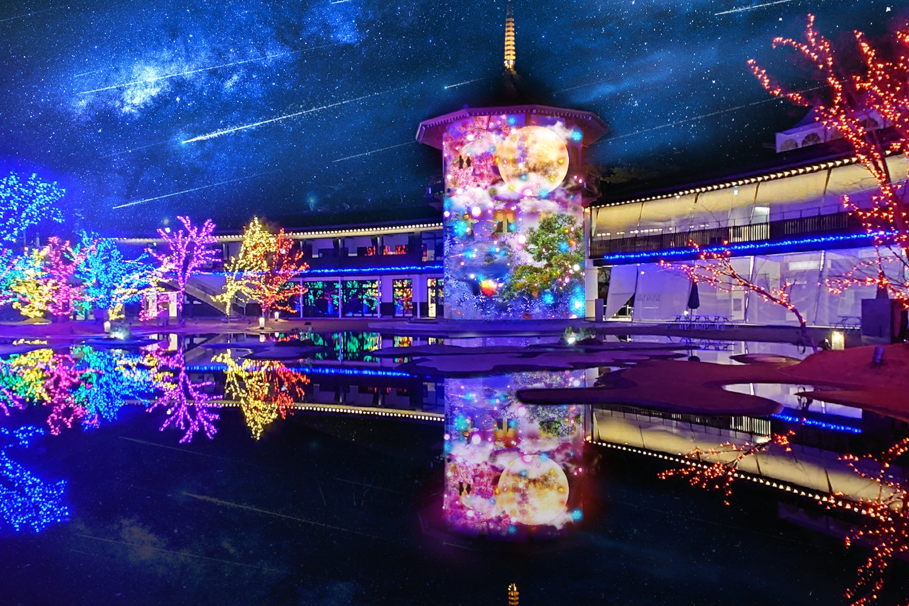 一般社団法人照明学会から2020年照明普及賞を受賞。14分間に1分消灯し、シャンパンゴールドと7色のカラーイルミネーションが交互に点灯する瞬間、幻想的な光景が広がります。