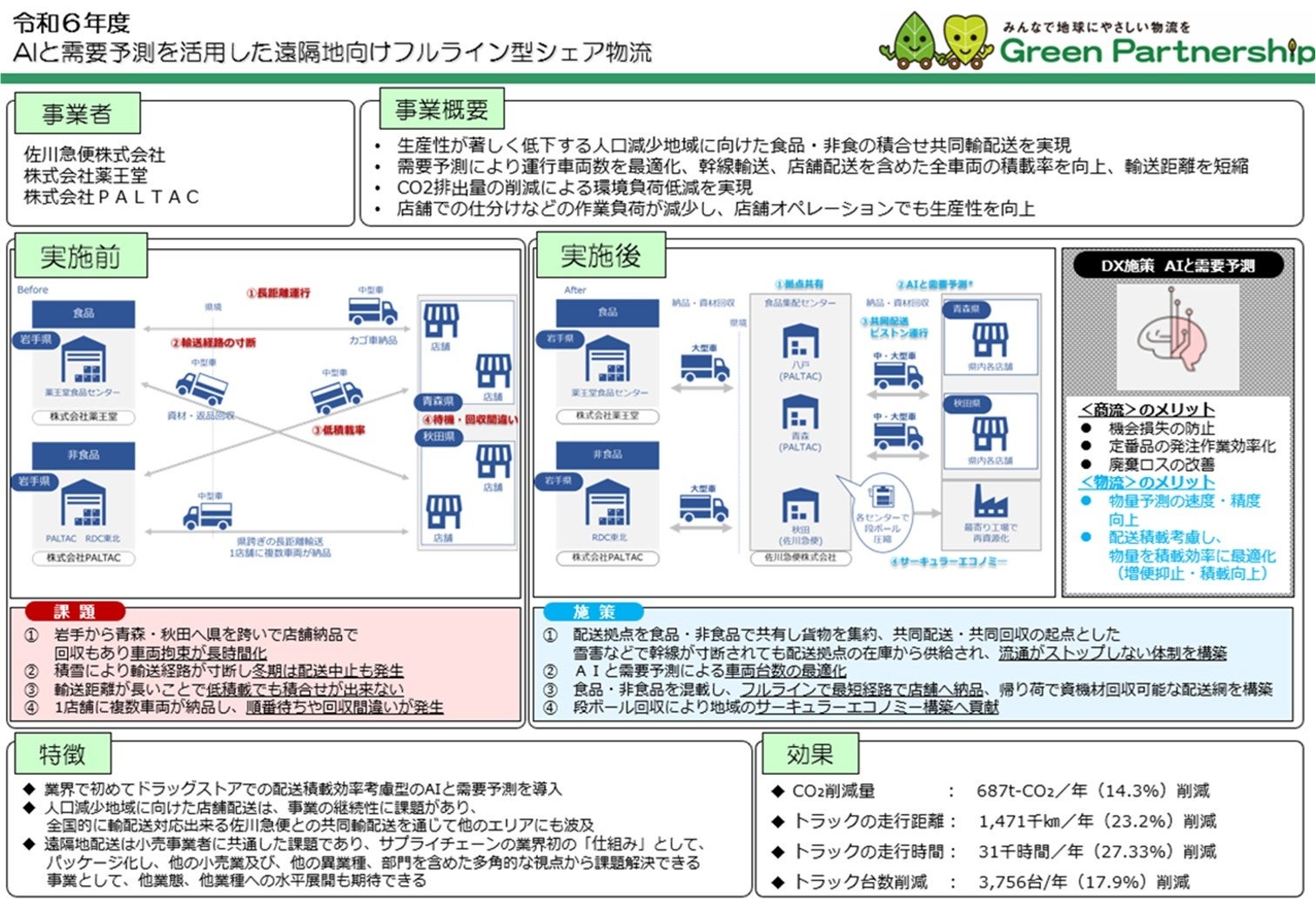 株式会社薬王堂(本社:岩手県盛岡市、代表取締役社長執行役員 西郷孝一)は、株式会社PALTAC(本社:大阪府大阪市、代表取締役社長 吉田拓也)及び佐川急便株式会社(本社:京都府京都市、代表取締役社長 木村正秀)と共に、グリーン物流パートナーシップ会議が主催する「令和6年度物流パートナーシップ優良事業者表彰」において「物流DX・標準化表彰」を共同受賞し、12月23日(月)に行われた「令和6年度グリーン物流パートナーシップ会議 物流パートナーシップ優良事業者表彰」において表彰されました。