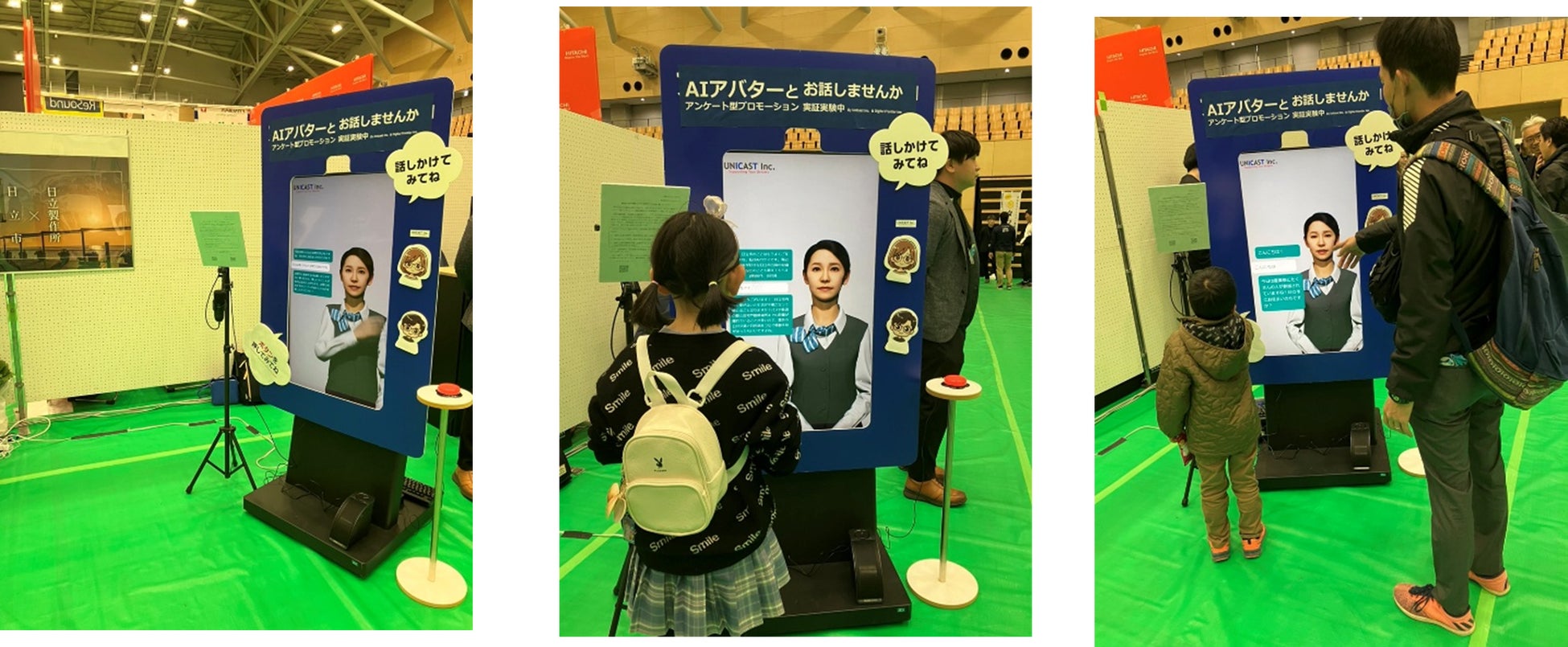 日立市産業祭は、日立市内で生産された新鮮な野菜や旬の魚介類などの展示販売はもちろん、市内に事業所のある企業が最新技術やサービスを紹介する場となっており、毎年多くの来場者があります。当社はこの機会を活用し、デジタル・サイネージに表示したAIエージェント※が来場者と自然な会話をしながら、意見を聴取できるか、PR効果が得られるかを検証しました。