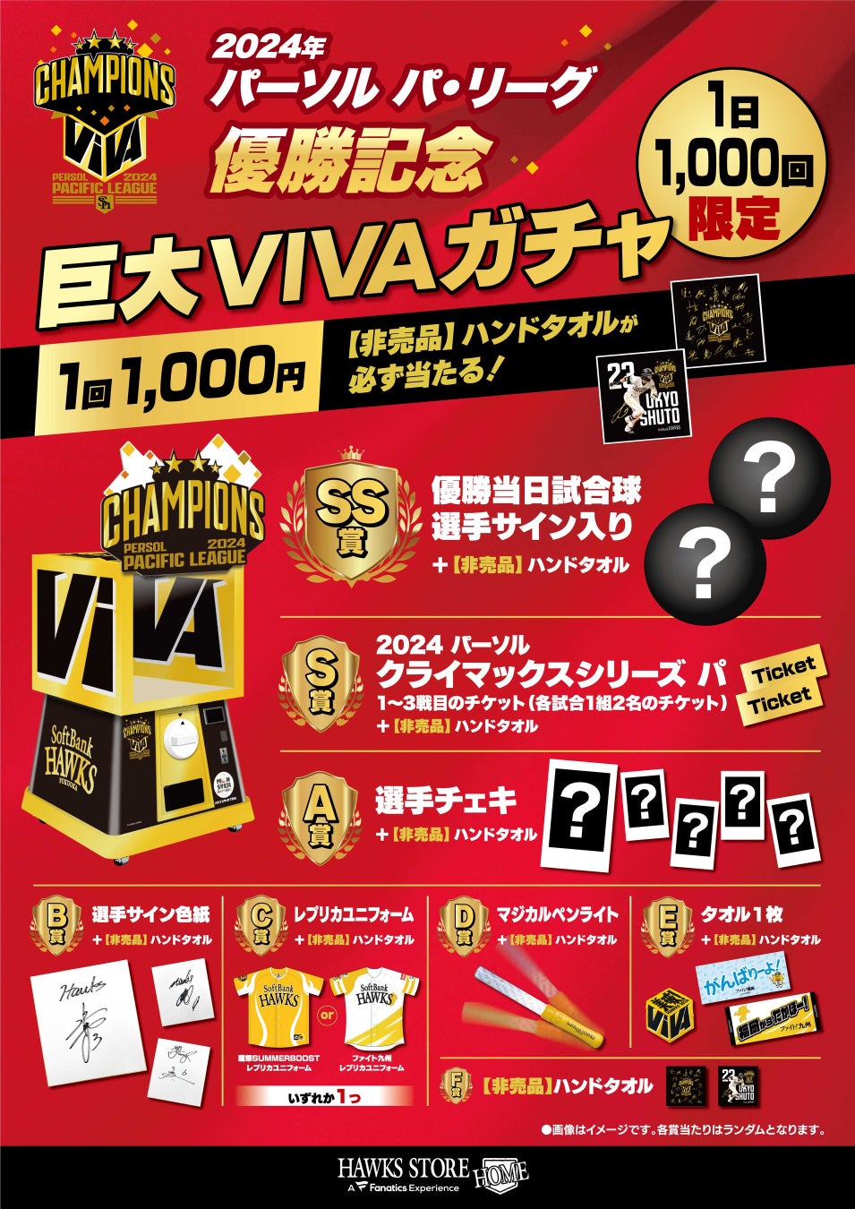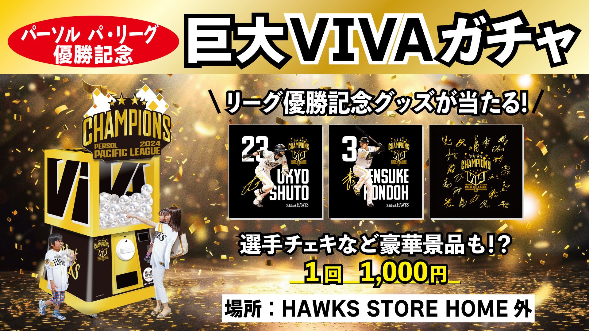 9月25日(水)~10月4日(金)試合開始4時間前~試合終了後1時間、みずほPayPayドーム試合開催日のみ先着3,000回まで。※1日最大1000回までを上限とし、リーグ優勝当日の試合球(選手サイン入り)、選手チェキ、非売品の優勝記念選手ハンドタオルなどが当たる巨大VIVAガチャが期間限定で登場します。なお巨大VIVAガチャの参加には当日の試合観戦チケットをお持ちの方で、1回1,000円(税込)1人最大5回まで参加が可能です。
