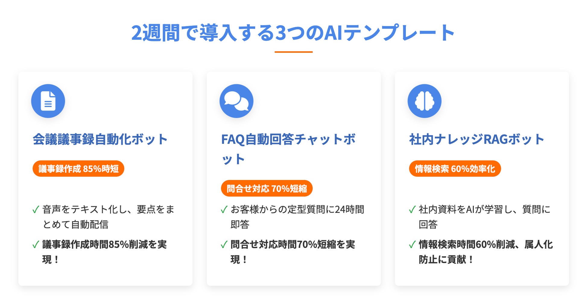 「会議の議事録を自動でまとめたい」「社内の知識を共有したい」「問い合わせ対応を効率化したい」──そんなお悩みに応える、優しく導入できるAI支援パッケージです。