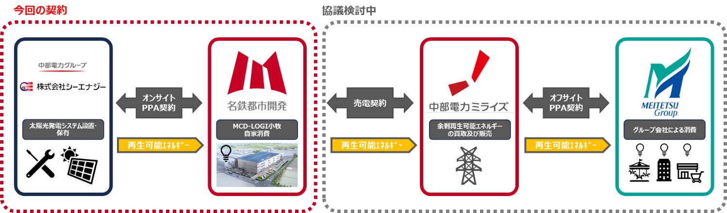 名鉄都市開発株式会社(本社:名古屋市中村区、代表取締役:日比野 博、以下、「名鉄都市開発」)と、中部電力ミライズ株式会社(本社:名古屋市中区、代表取締役:神谷 泰範、以下、「中部電力ミライズ」)の100%子会社である株式会社シーエナジー(本社:名古屋市東区、代表取締役:中川 治、以下、「シーエナジー」)は、脱炭素社会の実現に向けた取組みとして、名鉄都市開発が愛知県小牧市で開発保有するマルチテナント型物流施設『MCD-LOGI小牧』(以下、「MCD-LOGI小牧」)において、再生可能エネルギー(以下、「再エネ」)の利用を目的としたオンサイトPPA(Power Purchase Agreement:電力販売契約)契約を締結しましたので、お知らせいたします。名鉄都市開発として初めてオンサイトPPA締結となります。詳細は下記のとおりです。