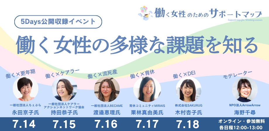 「ライフイベント」と「働く」が二者択一となってしまう社会課題の解決を目指す特定非営利活動法人ArrowArrow(代表理事:海野千尋)は、「働く女性のためのサポートマップ」の公開に合わせ、働く女性に関わる社会課題の今を考えるオンラインイベントを2025年7月14日(月)~18日(金)に無料開催いたします。