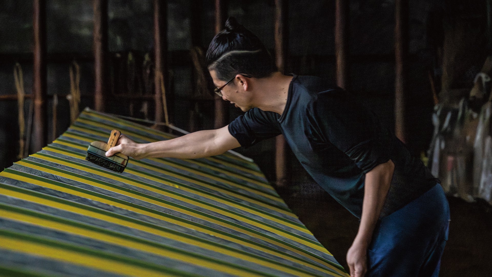 グラフィックデザイナー本多り子氏(asianvoice)とのコラボレーションから誕生したデザインです。幾度もの試作を経て、70年以上にわたり職人が数百万回繰り返してきた刷毛の動きが、そのまま大胆なグラフィックに結晶しました。引き染めの魅力である無地と組み合わせて、現代のファッションにマッチする洗練された配色が実現しました。