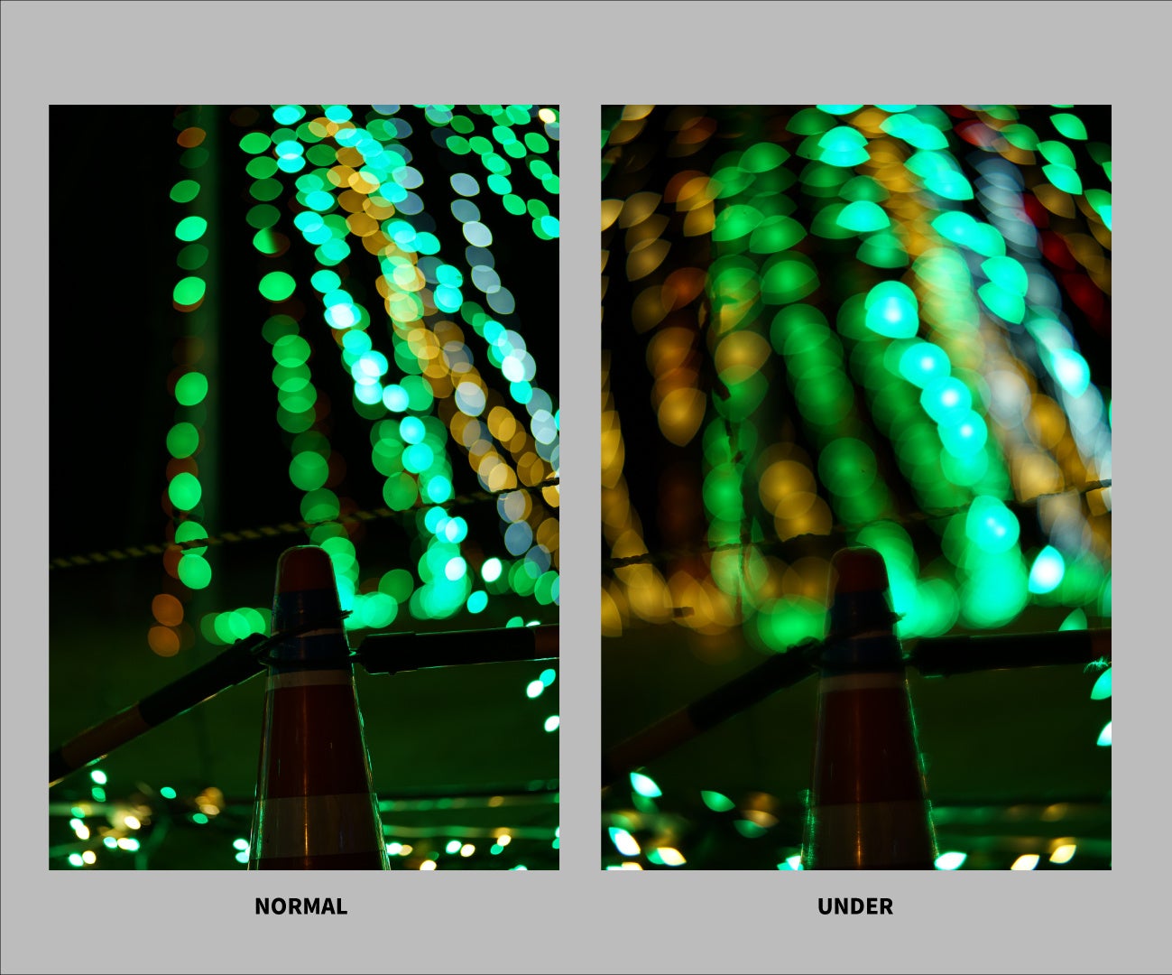 レンズ外周付近を通過する光が理想的なピント位置よりも前側に存在します。アンダーコレクション量が大きくなると、ピントのピークが低下し、ソフトフォーカスレンズのような描写になります。合焦点背景のボケは大きくやわらかになり、合焦点前側のボケは硬くバブルボケと呼ばれるボケになります。