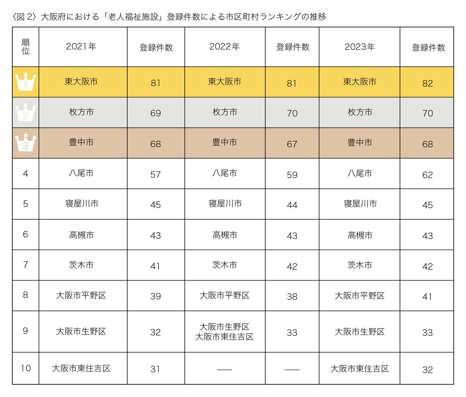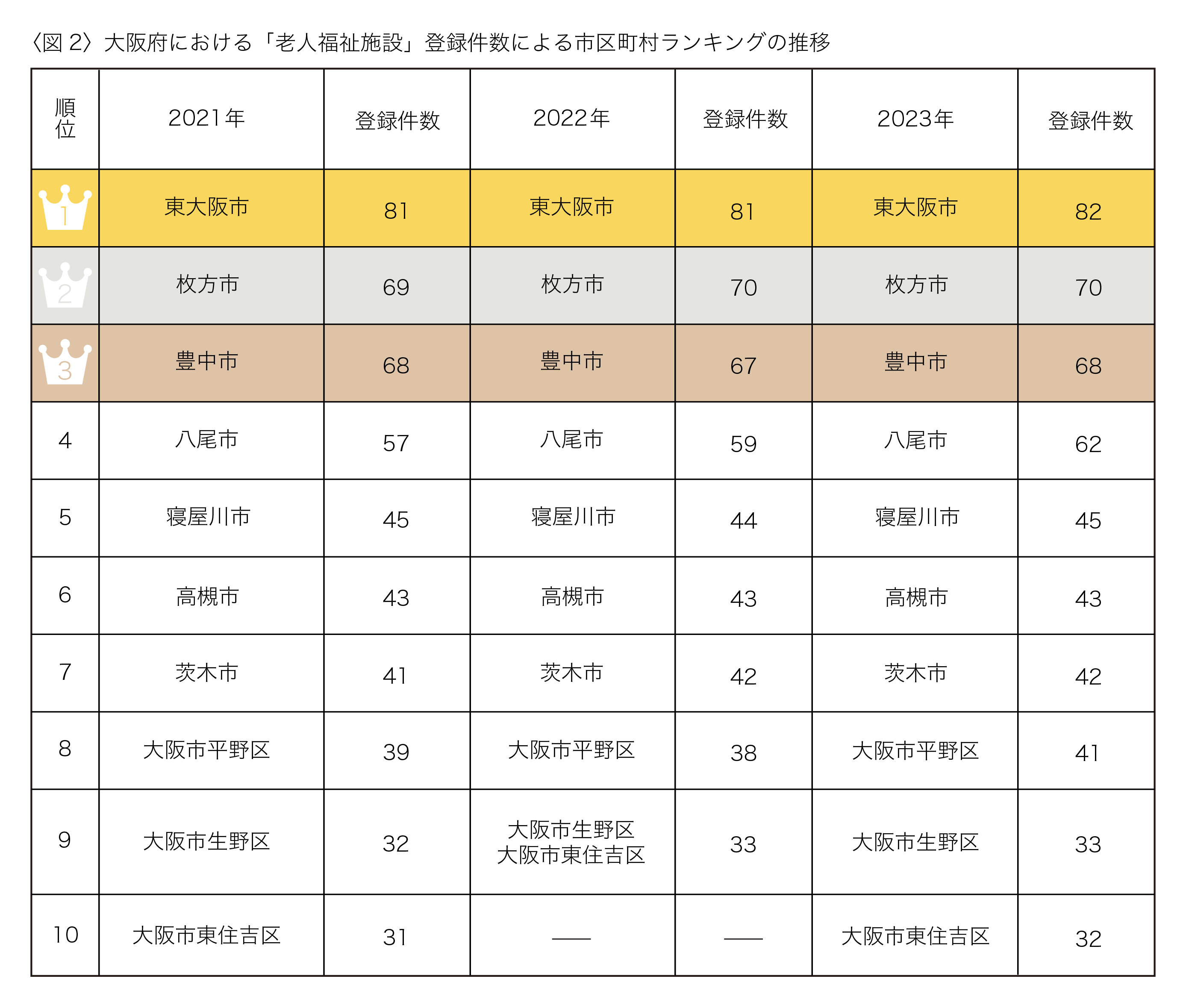2023年における大阪府で老人福祉施設の登録件数の多い地域は、1位が東大阪市、2位が枚方市、3位が豊中市となりました。これら3地域を含む上位10地域は、2021年から3年連続で順位を維持しています。