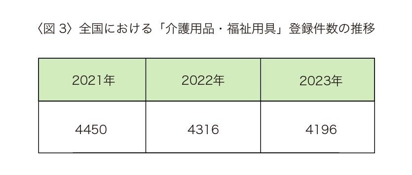 2023年における介護用品・福祉用具の登録件数は前年から減少しており、2021年から2年連続で減少していることがわかりました。2023年の登録件数は前年比で約2.8%減、2021年時点と比較すると約5.7%減少しています。