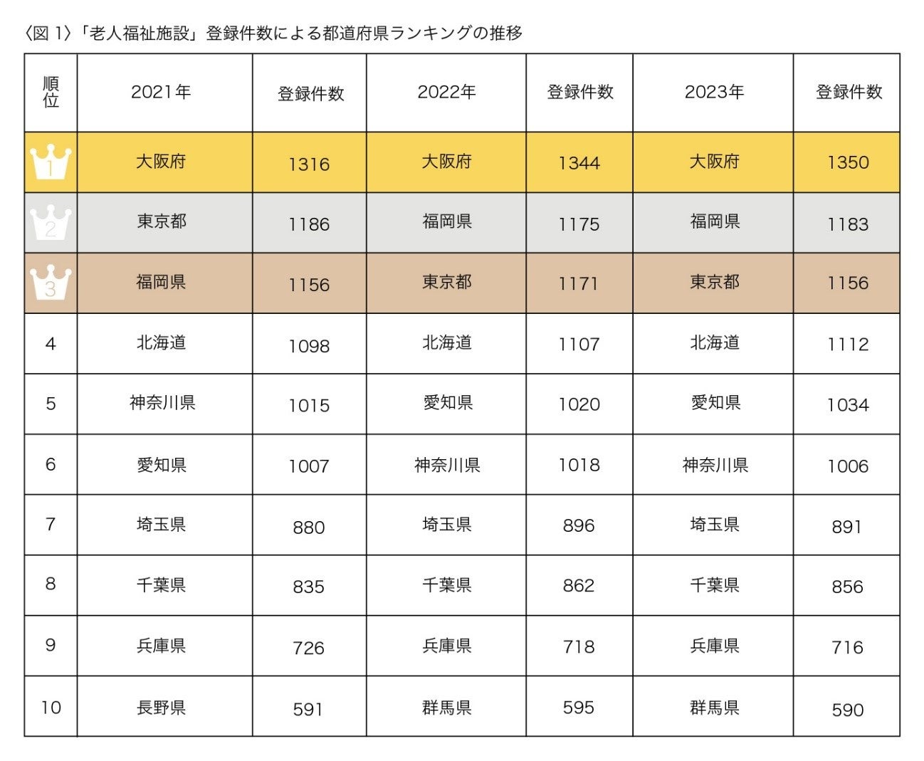2023年における老人福祉施設の登録件数の多い都道府県は、1位が大阪府、2位が福岡県、3位が東京都となりました。これらに4位の北海道を加えた4地域は、2021年から3年連続で順位をキープしています。