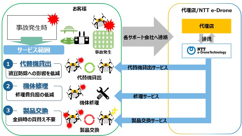 本サービスは、当社製農業用ドローン利用のお客様を対象に定額での修理サービスを提供します。また、適期防除期間のトラブル時でもタイミングを逃さずドローン散布ができるよう「代替機の貸出」を実施することで、お客様のトラブル時の対応をトータルサポートします。
