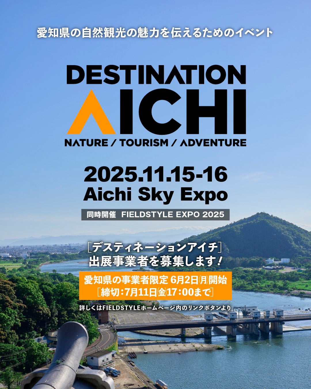 2025年11月15日(土)・16日(日)にAICHI SKY EXPO 愛知県国際展示場で「FIELDSTYLE EXPO 2025」を開催します。開催に伴い、来週6月2日(火)より出展者募集を開始致します。アウトドアレジャーに関するプロダクトやサービス、日々の暮らしの豊かさにも焦点を当て様々なライフスタイルを提案する事業者様を多く募集します。イベント規模としては、昨年11月と同様に屋内展示ホールと屋外多目的エリアを活用し、国内最大級規模での実施を予定しております。また、今回も愛知の自然観光と物産をテーマにしたイベント「DESTINATION AICHI(主催:愛知県)」を同時開催します。