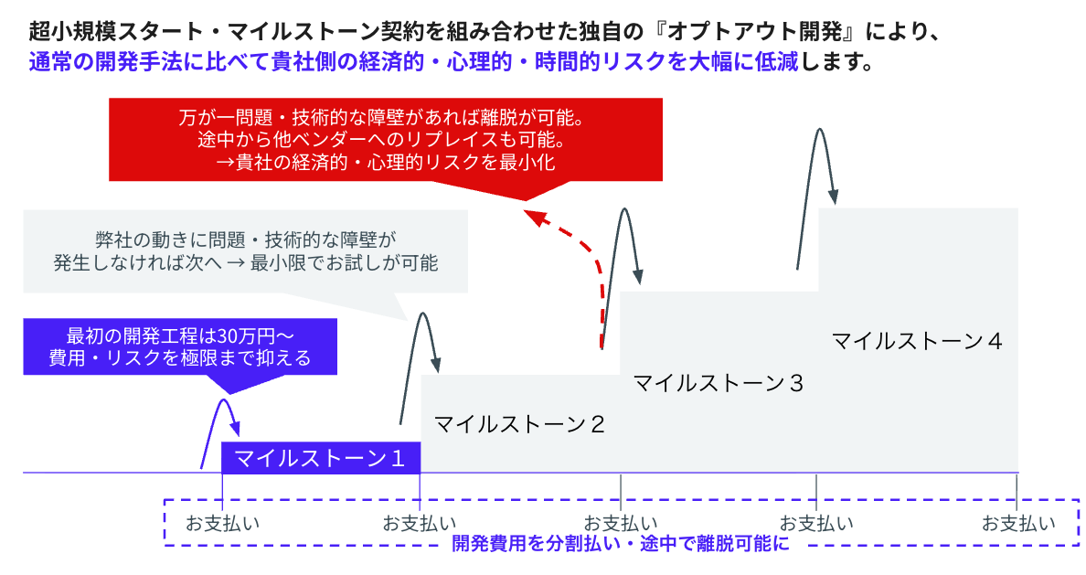 『オプトアウト開発』は、「低予算から始めやすい、超小規模スタート」と「途中で引き返しやすい、マイルストーン型契約」を組み合わせた当社独自の開発手法です。